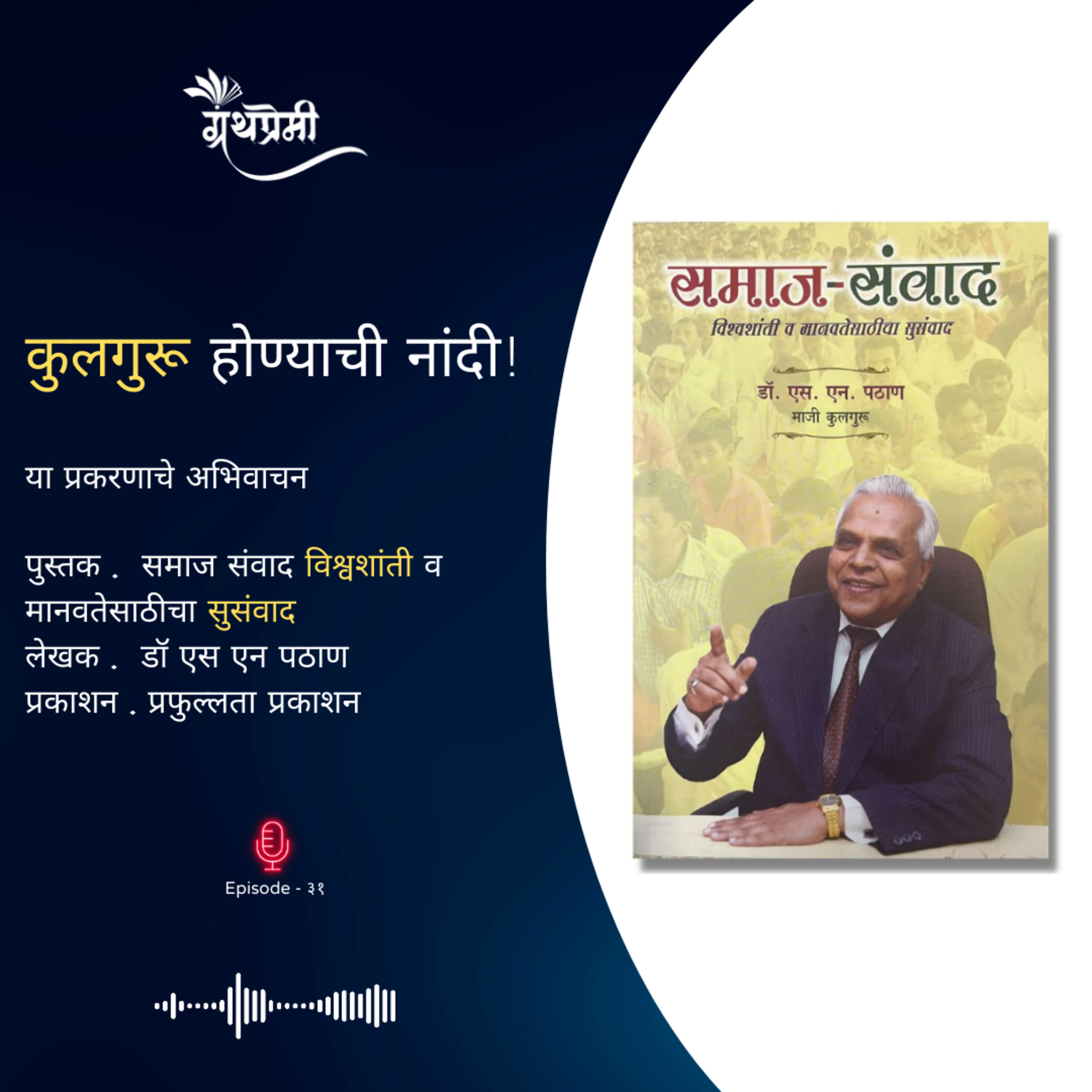 विषय - 'कुलगुरू होण्याची नांदी!' प्रकरणाचे अभिवाचन "समाज संवाद" या एस. एन . पठाण यांच्या पुस्तकातून पुस्तक - समाज संवाद - विश्वशांती व मानवतेसाठीचा सुसंवादलेखक - एस. एन . पठाण प्रकाशन - प्रफुल्लता प्रकाशनआवाज - द्वितीया