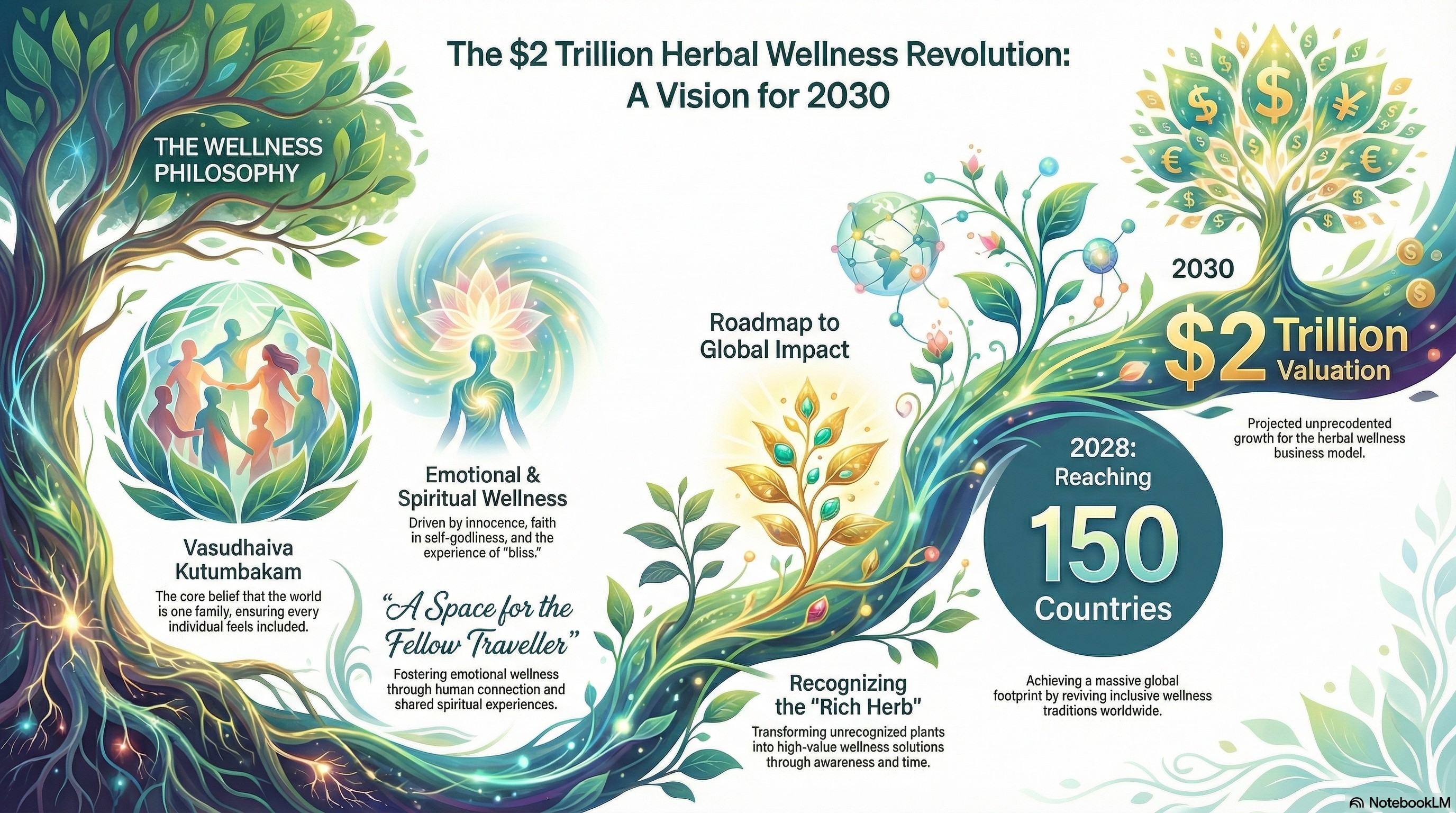 This visionary text outlines an ambitious herbal wellness revolution that seeks to merge spiritual philosophy with massive global scale. The author anticipates a multi-trillion dollar industry by the year 2030, driven by a mission to restore inclusive traditions across 150 different nations. Central to this movement is the concept of universal kinship, where emotional healing is fostered through shared empathy and a deep faith in the self. The narrative portrays herbal medicine as a misunderstood gift of nature that gains its true value once its inherent power is finally recognised. Ultimately, the source advocates for a life of gratitude and bliss, encouraging a shift away from the ego toward a more connected existence.