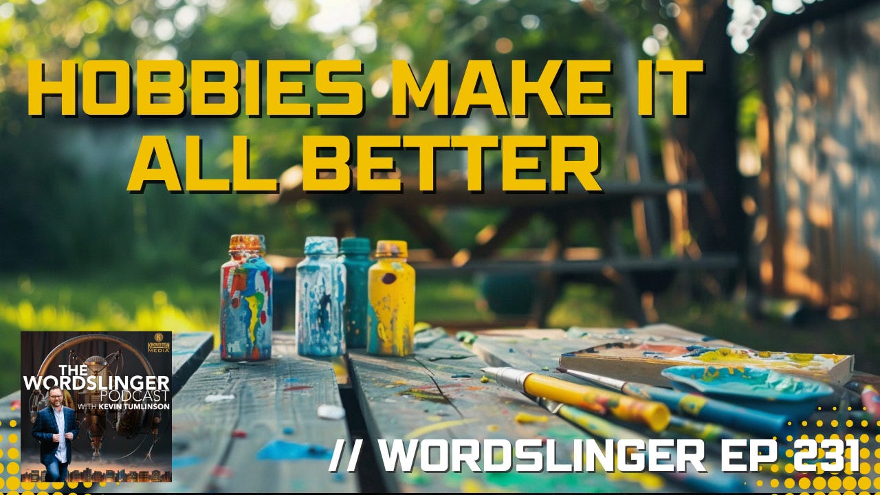 It’s a Solo Slinger episode, and this week I’m talking about refiling your bucket, sharpening your axe and/or saw, and basically just improving your mental health and your creative work by finding hobbies and other experiences. We’e in the business of observing, contemplating, and expressing, so we could use some interesting things to observe.