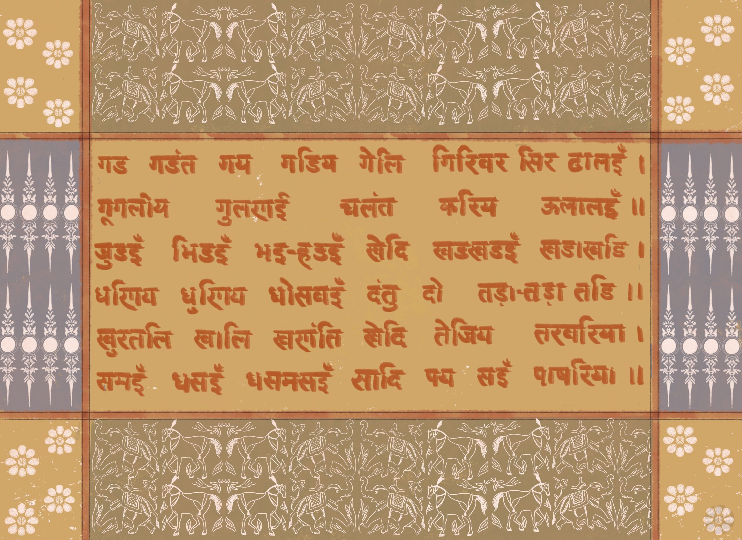 (the stanza of verse in the image comes from the text of Bāhubalī rāsa by 13th Century AD Jain poet Shalibhadra Suri, it is an onomatopoeic stanza that describes the activities done by elephants, soldiers and horses.)