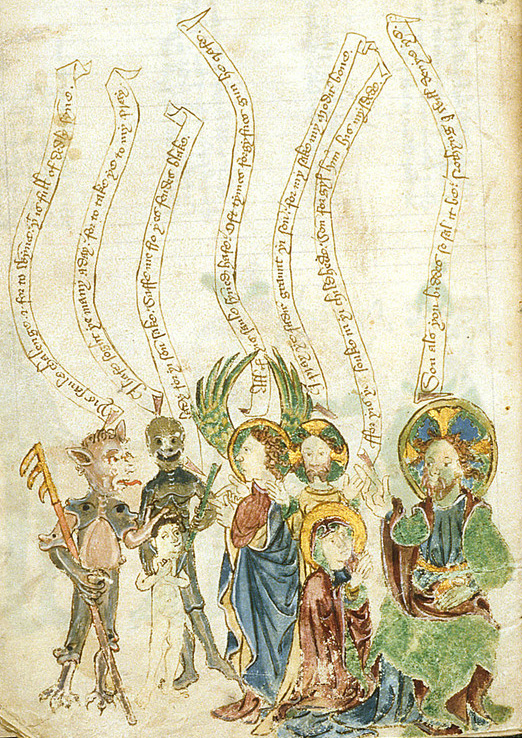 This week’s image is an illuminated miniature from a 15th C manuscript held by the British Museum, depicting the “Debate for the Soul.”