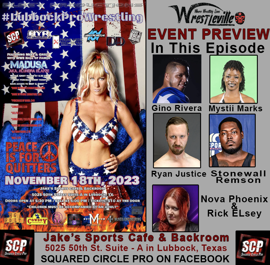 On November 18th in Lubbock, Texas, Squared Circle Pro will be the event, “Peace is for Quitters.” In this episode you will hear from Gino Rivera, Ryan Justice, Msytii Marks, Nova Phoenix, and Stonewall Remson. Eight matches are scheduled with some of the hottest indie wrestler of our time! Also at the event with Madusa! GO TO SQUARED CIRCLE PRO on Facebook!
