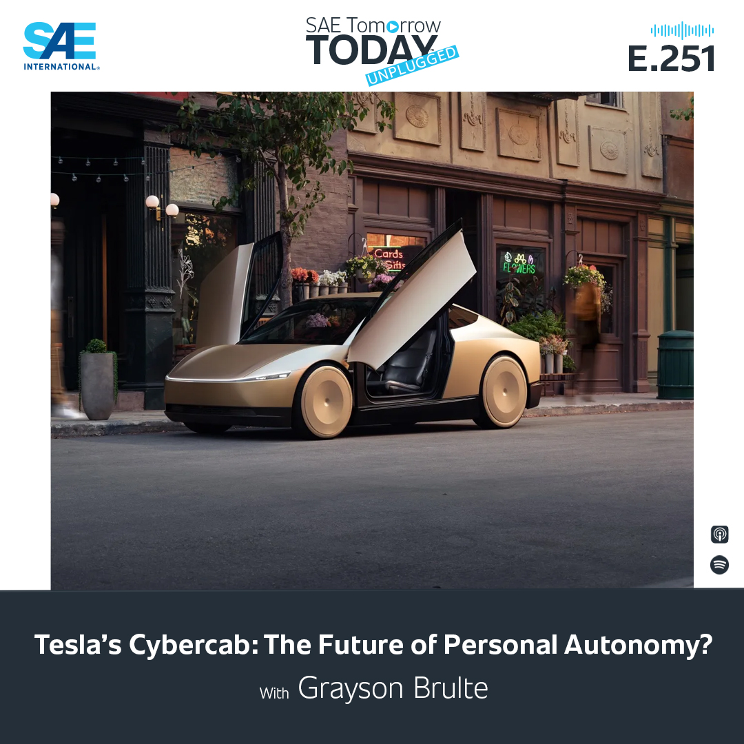 In this Unplugged episode of SAE Tomorrow Today, host Grayson Brulte discusses how software has fundamentally transformed various industries with a focus on Tesla’s recently unveiled Cybercab, and how the strategy for this two-passenger AV could signal a shift away from shared robotaxis toward personal AV ownership.