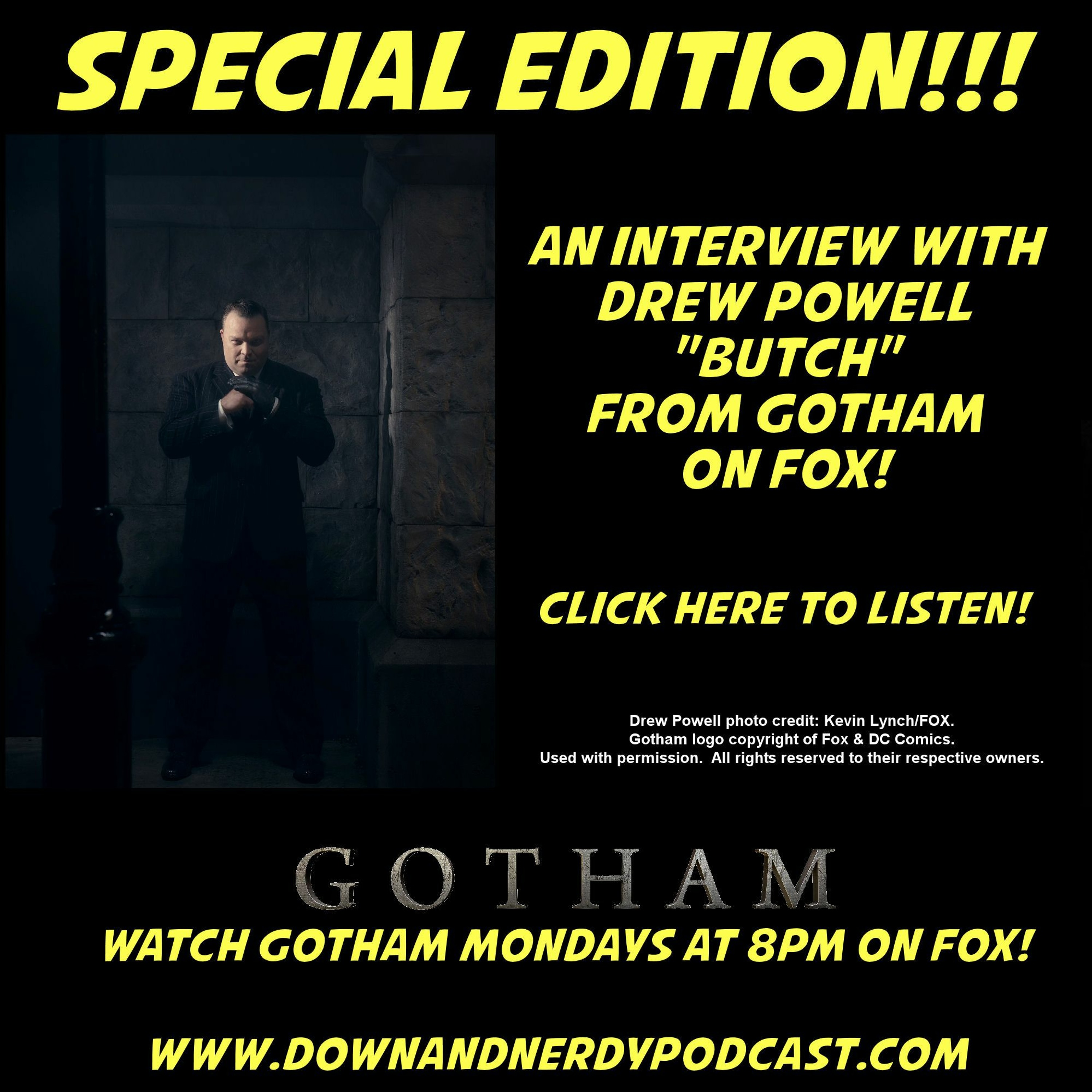 It's a special edition of the Down and Nerdy Podcast, as the guys sat down with Drew Powell from "Gotham" on FOX! They discuss Butch and Penguin's relationship going into season three, what exciting things people can expect this season, as well as Butch the indycar driver! Watch "Gotham" Mondays at 8pm ET on FOX!