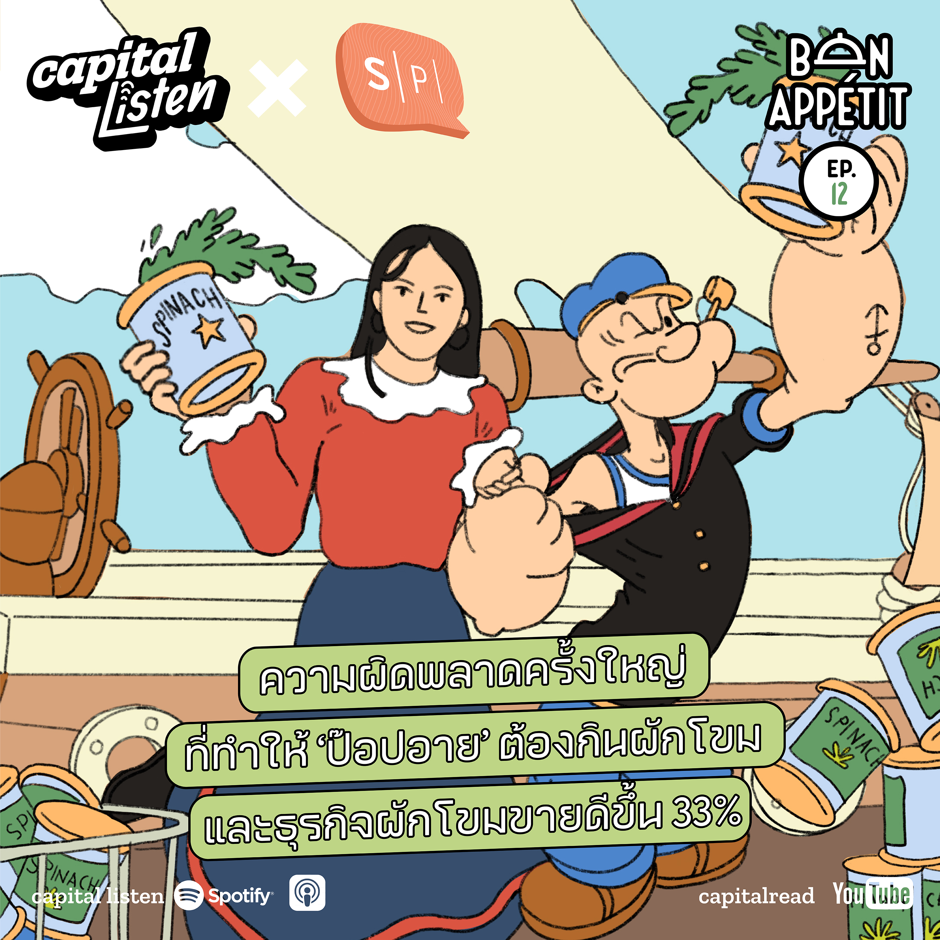 หลายคนน่าจะรู้จัก ‘ป๊อปอาย’ ชายสูบไปป์ใส่ชุดกะลาสีเรือที่เวลาปกติก็ดูเป็นชายรูปร่างธรรมดา แต่กล้ามจะโตขึ้นจนมีพละกำลังแข็งแกร่งเกินมนุษย์เมื่อเปิดฝากระป๋องเทผักโขมเข้าปาก แต่ใครจะรู้ว่าเบื้องหลังของการกินผักโขมของป๊อปอายมาจากความผิดพลาดในการใส่จุดทศนิยมตอนบันทึกค่าสารอาหารธาตุเหล็กที่อยู่ในผักโขมจนเกิดความเข้าใจผิดที่ส่งผลกว่าที่คิด เบื้องหลังความผิดพลาดครั้งนี้เป็นยังไงและส่งผลยังไงบ้าง ฟังได้ใน Bon Appetit EP12
