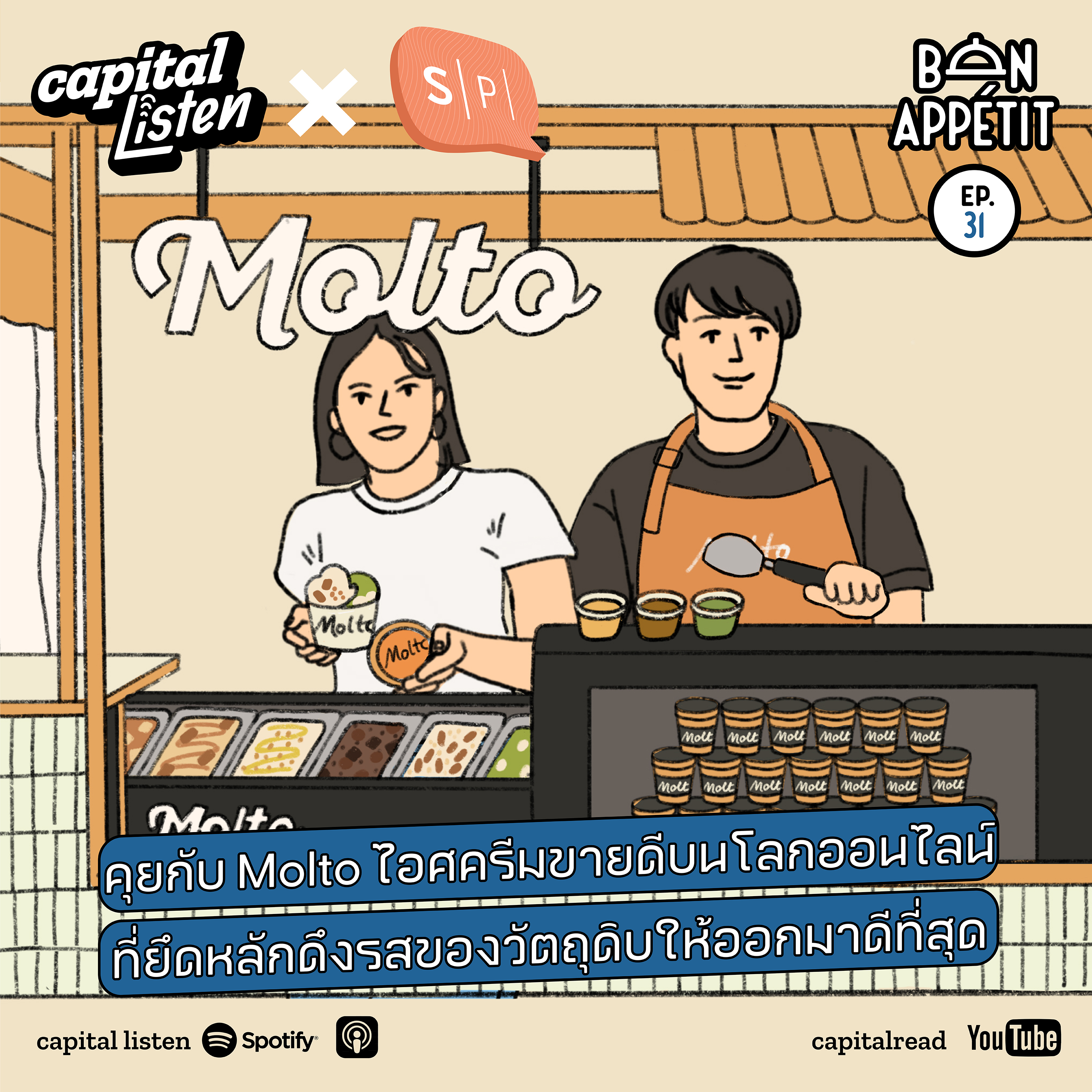 ใครที่ชื่นชอบไอศครีมคงไม่มีใครไม่รู้จักไอศครีมเจลาโตพรีเมียมชื่อ Molto เพราะนอกจากความหลากหลายของรสชาติที่มีกว่าร้อยรสให้เลือก ทุกๆ รสชาตินั้น Molto ยังยึดหลักการดึงรสของวัตถุดิบให้ออกมาดีที่สุด จนกลายเป็นไอศครีมที่ขายดิบขายดีบนโลกออนไลน์ จากความใส่ใจในรสชาติไอศครีม Bon Appetit EP.31 จึงชวน ธฤษณุ คมโนภาส เจ้าของร้าน Molto มาเล่าถึงเบื้องลึกเบื้องหลังของการทำร้านไอศครีมคราฟต์ ไปจนถึงพูดคุยเกี่ยวกับวิธีคิดในการทำแบรนด์ที่ประกอบรวมกันจนร้านไอศครีมแห่งนี้เติบโต
