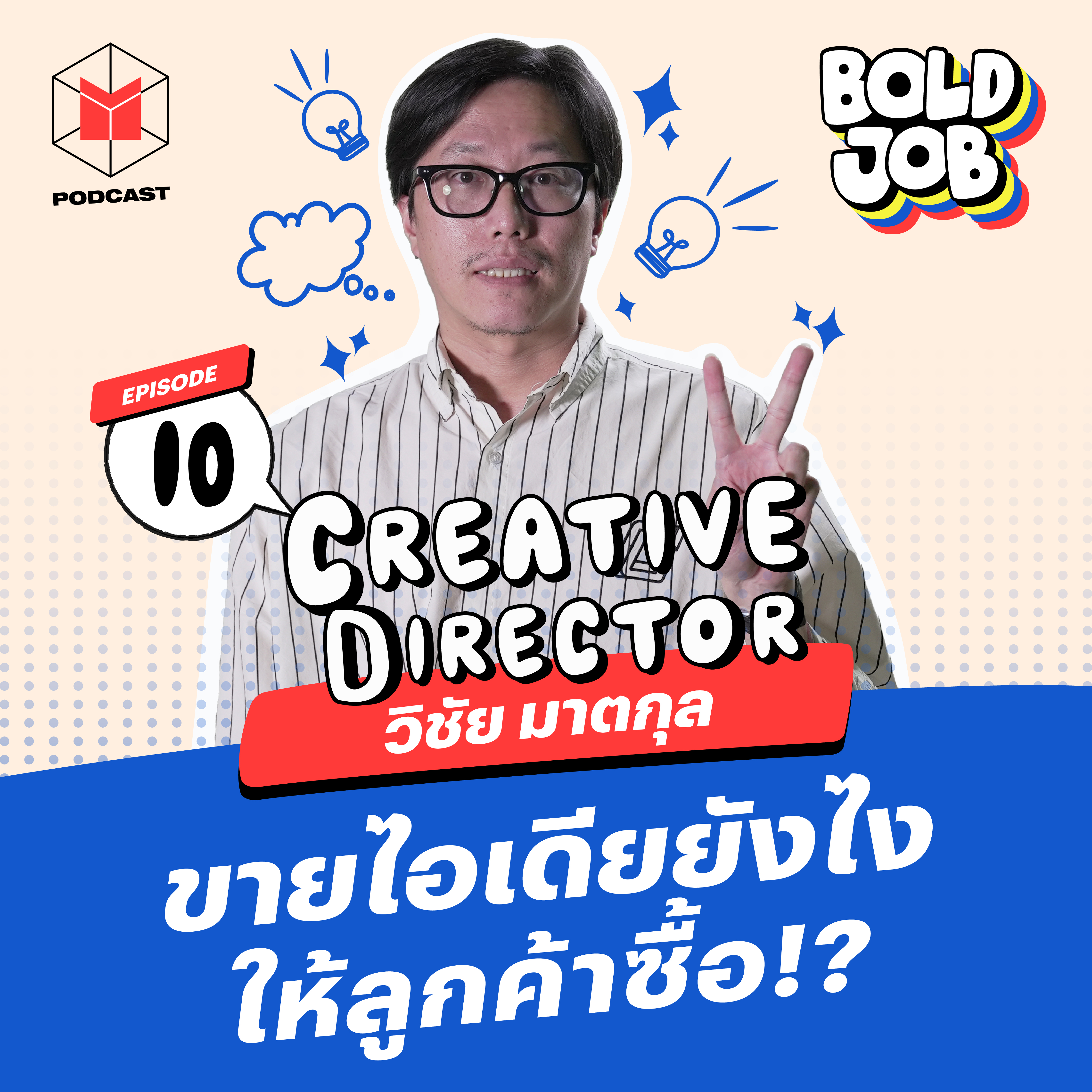 ทำไมไอเดียดีๆ มักมาตอนไม่ได้ทำงาน? สายงานโฆษณาเป็นอีกหนึ่งอาชีพคูล ๆ ที่ใครก็อยากเข้ามาทำ รายการ BOLD JOB EP.10 พาไปทำความรู้จักให้ลึกถึงเนื้องานความรับผิดชอบในอาชีพ Creative Director พร้อมกับ ‘วิชัย มาตกุล’ จาก salmon house ตั้งแต่เช้าจรดเย็นคนเป็นครีเอทีฟมีอะไรต้องทำบ้าง? ที่สำคัญ…ถ้าครีเอทีฟคิดงานไม่ออกจะทำยังไง? มีทริคอะไรที่ขายไอเดียให้ลูกค้าซื้อ? บอกเลยว่าฟังพอดแคสต์นี้แล้วคุณอาจจะเข้าใจอาชีพนี้เปลี่ยนไปก็ได้