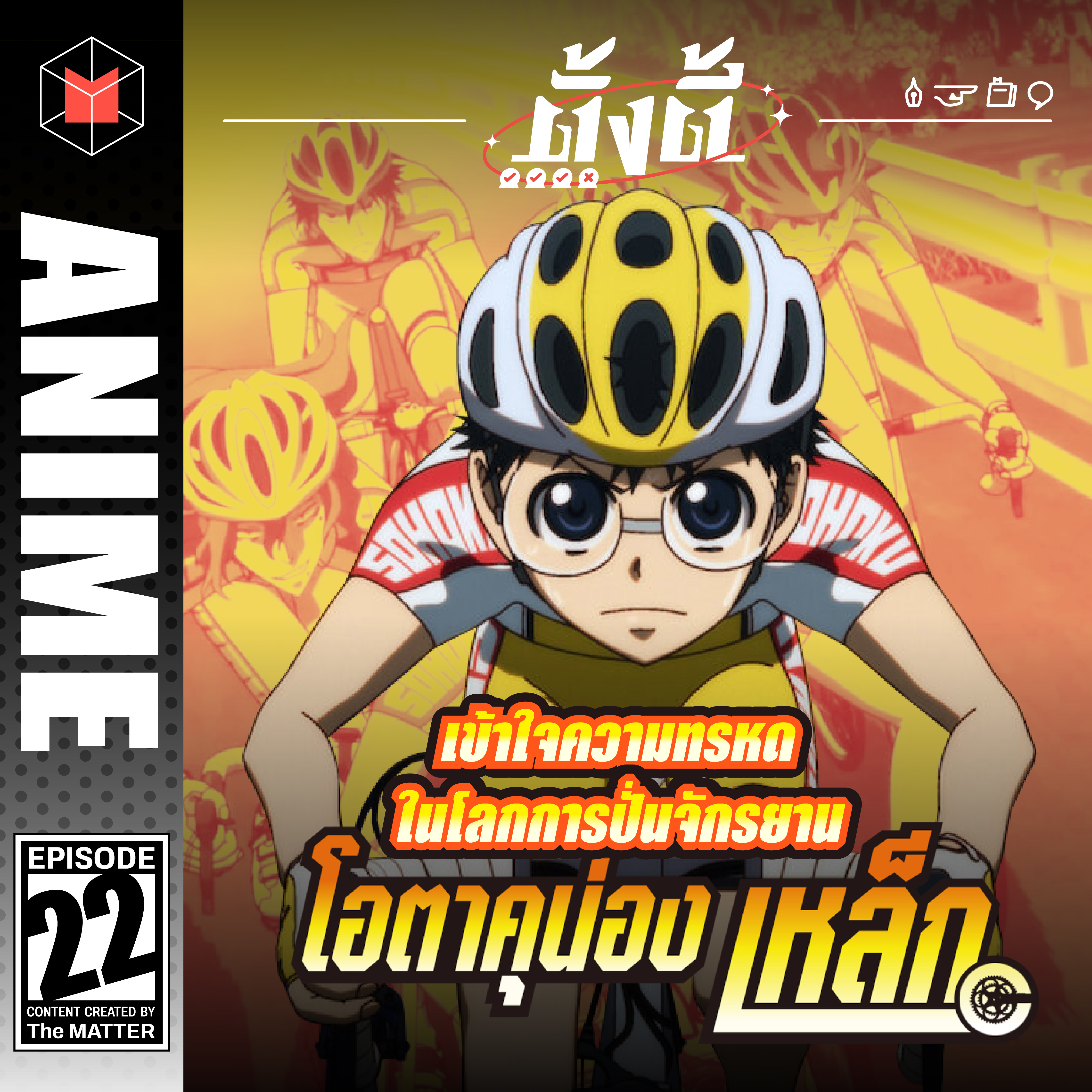 โอตาคุน่องเหล็ก หรือ Yowamushi Pedal ว่าด้วยเรื่องราวของเด็กหนุ่มผู้ไม่เคยสนใจการเป็นนักปั่นจักรยาน แต่กลับมีพรสวรรค์ต่อกีฬาชนิดนี้อย่างไม่รู้ตัว ปล่อยให้เรารับชมอนิเมะในซีซั่นที่ 5 ไปแล้ว รายการ #ตั้งตี้ ขอชวนคุยทุกเรื่องราวของการปั่นจักรยาน อนิเมะเรื่องนี้สะท้อนวัฒนธรรมการใช้จักรยานของผู้คนอย่างไร เรามองเห็นเทคนิคและความเนิร์ดอะไรบ้าง และคุยให้ลึกถึงความทรหดในโลกของการปั่นจักรยานในประเทศไทย ถ้าพร้อมแล้วไปฟังกันได้เลย!