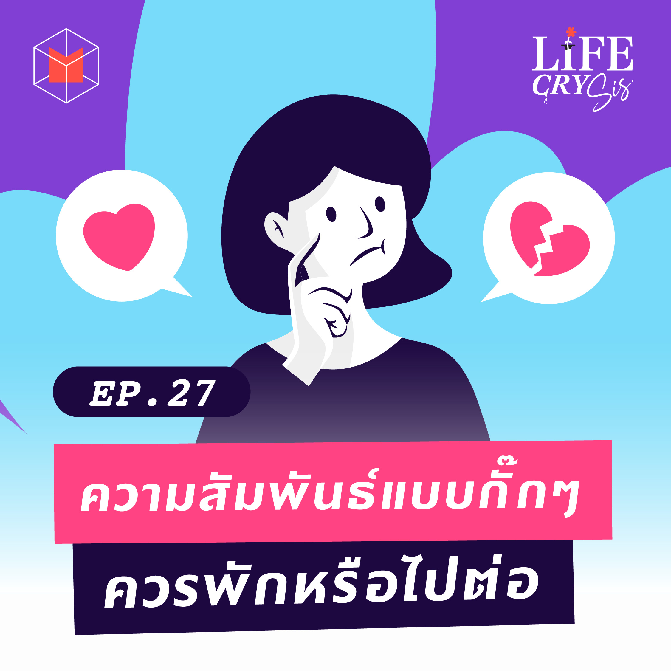 บอกว่าชอบแต่ก็เป็นได้แค่คนคุย โทรหากันทุกคืนแต่เป็นได้แค่พี่น้อง เมื่อรู้สึกเหมือนโดนกั๊กในความสัมพันธ์ เราควรไปต่อหรือพอแค่นี้? เพราะความไม่ชัดเจน คุยหยอดกันไปมาโดยไม่มีสถานะ ดูเหมือนจะเป็นแฟน แต่ก็ไม่ใช่ ความคลุมเครือต่างๆ จึงทำให้เรารู้สึกกลัว มาเข้าใจความสัมพันธ์แบบกั๊กๆ ในเชิงจิตวิทยา พร้อมกับดูแลหัวใจตัวเองไปพร้อมกับ ‘ใบเตย - วริษฐา แซ่เจีย’ Content Writer จาก The MATTER และ ‘มะเฟือง - เรืองริน อักษรานุเคราะห์’ นักจิตบำบัด และเจ้าของเพจสุขภาพจิต Beautiful Madness by Mafuang ได้ในรายการ Life CRY SIS ตอนนี้กันได้เลย