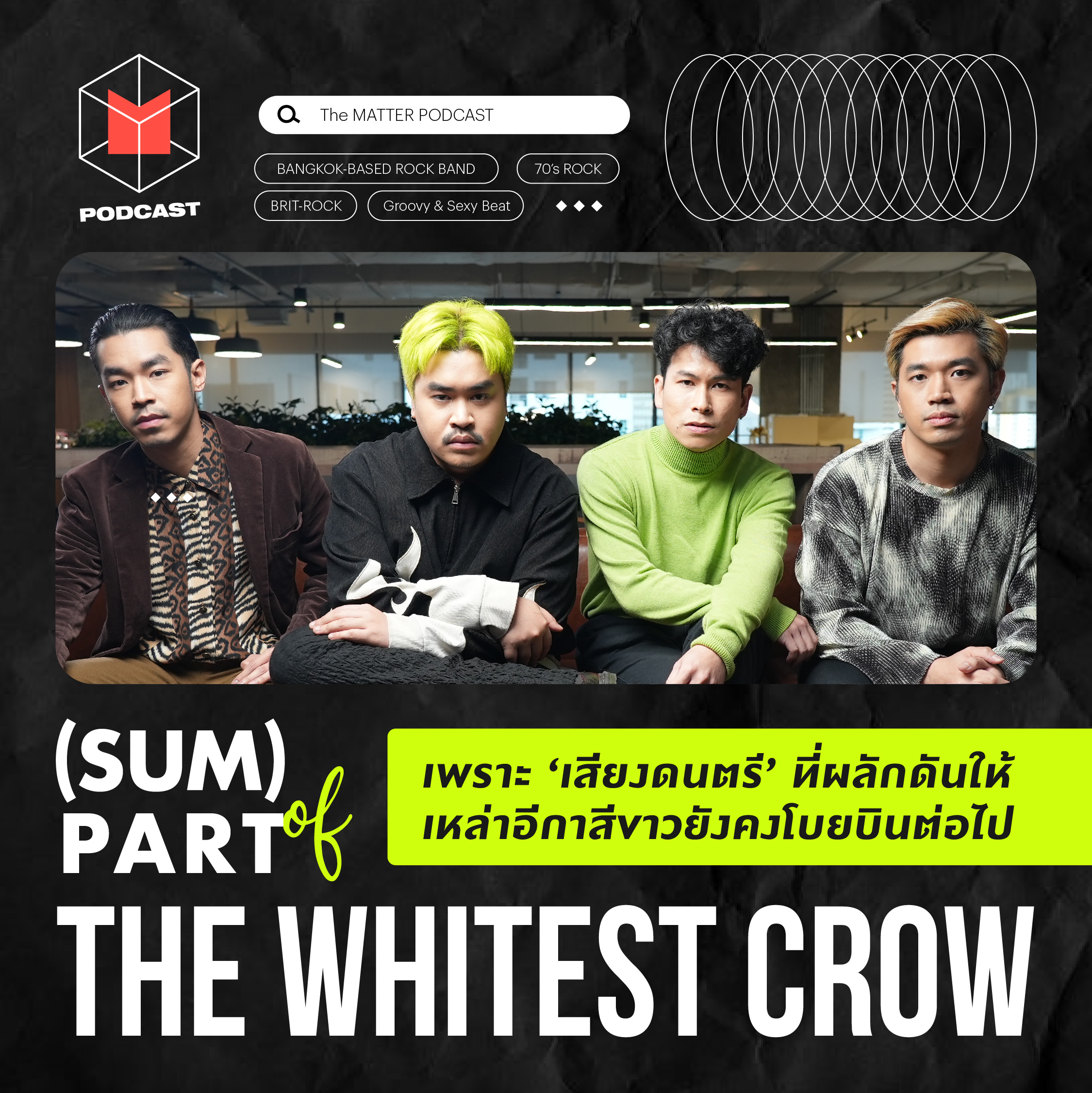 รายการ (SUM) PART ชวน ‘ไตเติ้ล-อ๋อง-เบ็น-แบงค์’ จากวง The Whitest Crow วงอินดี้ร็อคที่รวมตัวกันทำเพลงกันเองตั้งแต่เรียนมหาวิทยาลัย ก่อนที่พวกเขากำลังเดินทางในเส้นทางใหม่ในค่ายใหญ่อย่าง Genie Records แต่ใครจะรู้ว่าเบื้องหลังการเป็นนักดนตรี พวกเขายังมีอาชีพที่สองเป็นงานประจำ เช่น HR ในหน่วยงานรัฐ พนักงานฝ่ายขาย ครีเอทีฟ และพนักงานในบริษัทเอเจนซี่