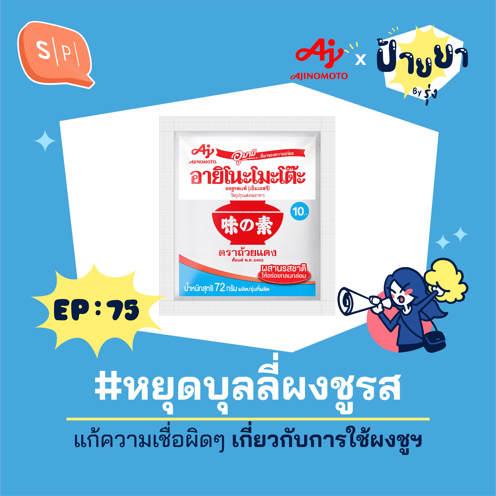 แต่พอดแคสต์ ป้ายยา อีพีนี้ และ อายิโนะโมะโต๊ะ จะมาแก้ความเชื่อนั้นว่า มันไม่จริง! กับรุ่งฤดี และ #ภาคีชาวนัว ที่ชอบอาหารนัวๆ ทั้งหลาย ให้ทุกคนได้ใช้ผงชูรสได้อย่างสบายใจได้เลย