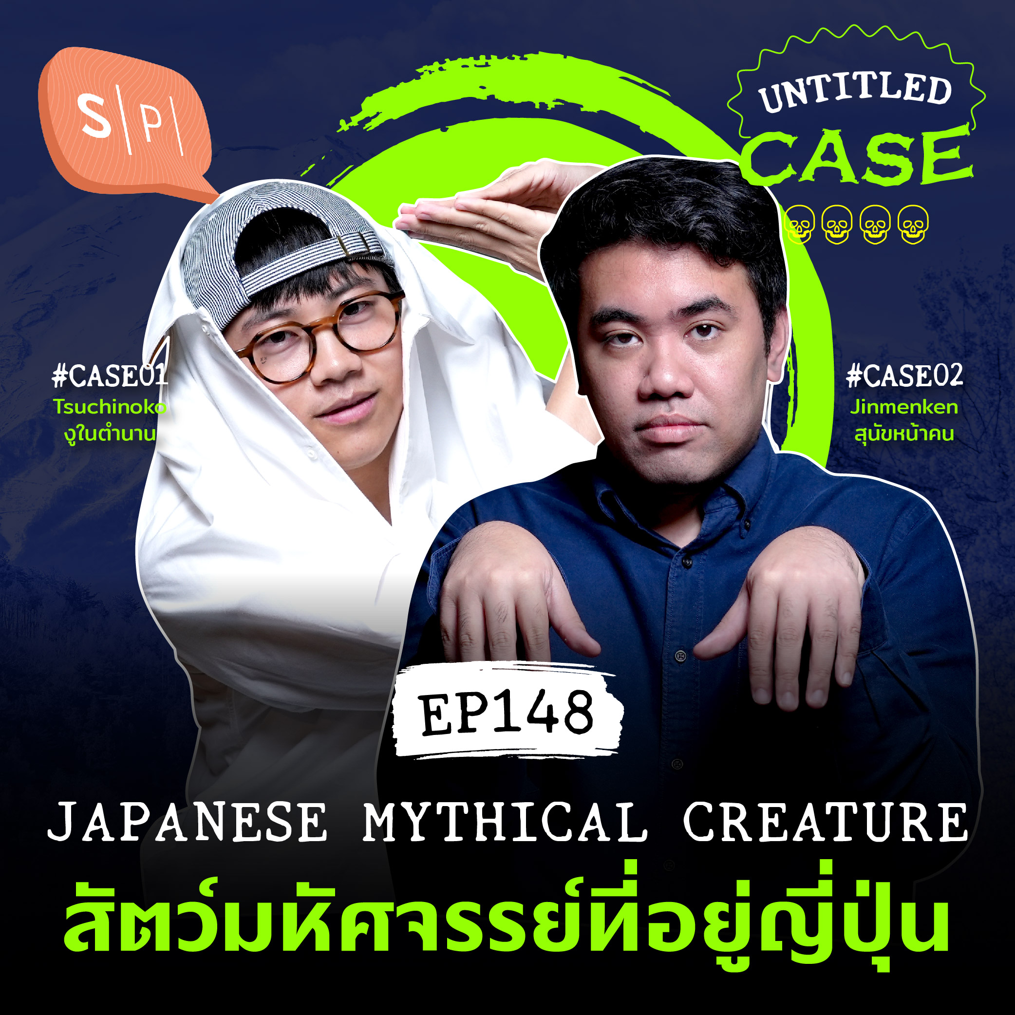 ตำนานแรก คือปีศาจงูที่หลายๆ คนอาจจะคุ้นชินจากภาพลักษณ์อันอาโนเนะในการ์ตูนโดราเอมอน - สึจิโนโกะ (Tsuchinoko) งูตัวสั้นที่มีเอกลักษณ์ที่ท้องป่องกลางตัว มีที่มาอย่างไร และมีทฤษฎีอะไรที่จะหาตัวตนที่แท้จริงของมัน ส่วนตำนานที่สองคือ Jinmenken หรือ หมาหน้าคน อันลือเลื่อง เด็กไทยอาจเคยเห็นจากการ์ตูนผีปีศาจขึ้นหิ้งอย่าง นูเบ มืออสูรล่าปีศาจ ต้นกำเนิดของปีศาจปากจัดขี้บ่นชนิดนี้เป็นอย่างไร ไปฟังกันได้ ใน Untitled Case เอพิโสดนี้