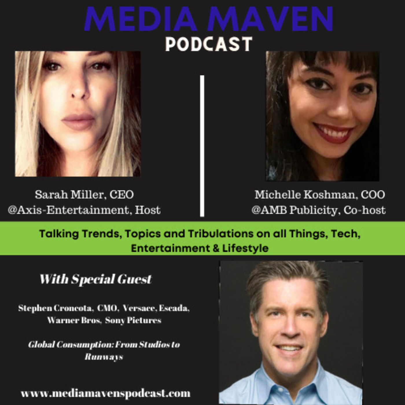 Media Maven Host, Sarah Miller, CEO, Axis Entertainment & CEO Media Excellence Awards and Co-Host, Michelle Koshman spend time talking about Branded Entertainment, Content and Fashion with Stephen Croncota, Chief Marketing Officer, Versace, Escada, Warner Bros, Sony Pictures from Italy!