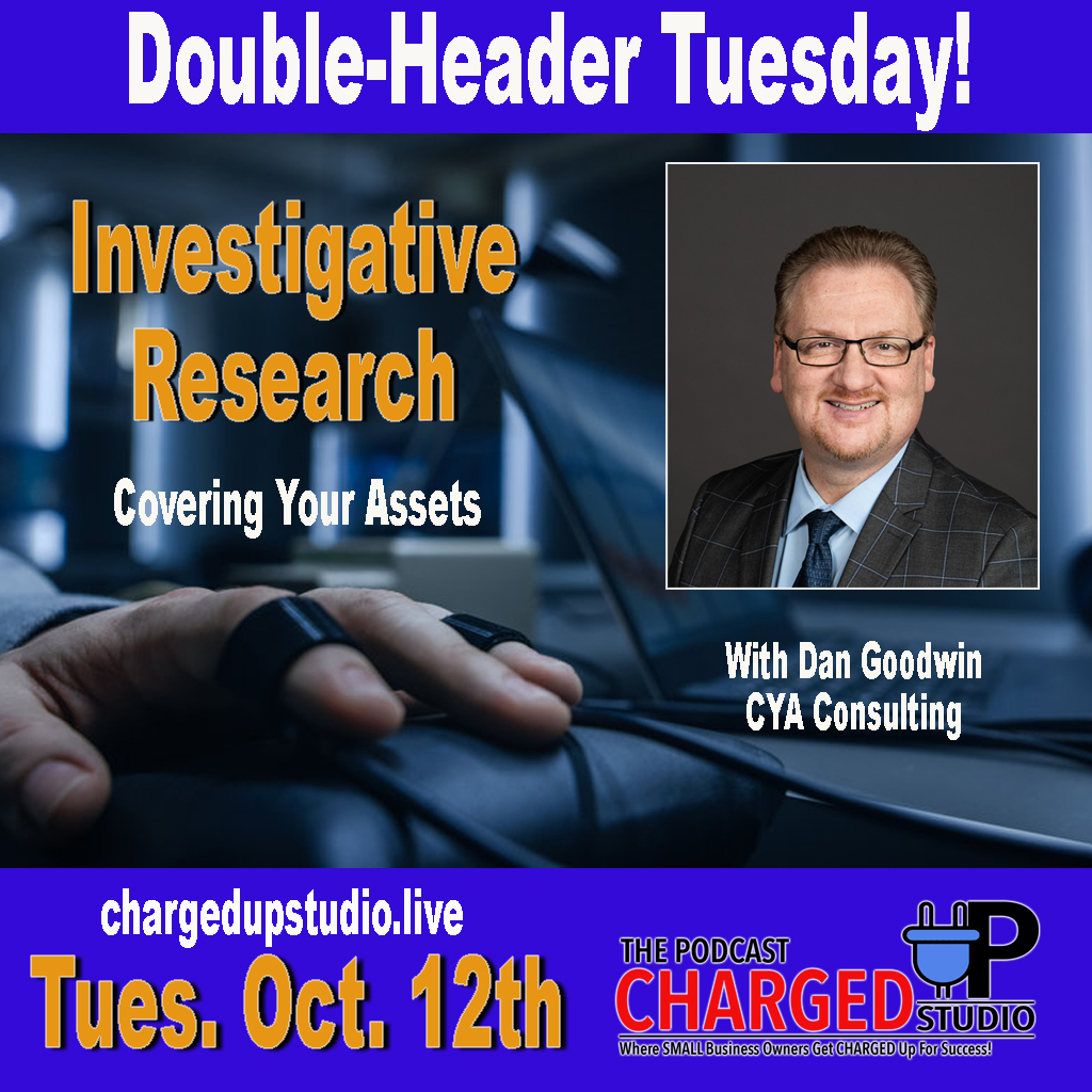 October 12th is another Double Header Tuesday at Charged Up Studio. Tune into CSI Business at 9 am Tuesday, October 12th as Dan Goodwin with CYA Consulting joins host Danna Olivo to talk about why we as small micro-business owners should be diligent in the inquiries of our business and personal connections. Find out how to be proactive to protect yourself and your business. Investigative Research is an often overlooked necessity when it comes to small micro-businesses, and it could cost you your business.