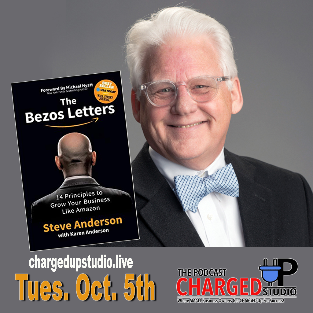 October 5th is Double Header Tuesday at Charged Up Studio. When you hear the brand name Amazon what is the first thing that comes to mind? Is it books on demand…Kindle…same-day delivery…good prices? Whatever comes to mind, unless you’re living under a rock, the fact remains that Amazon has touched every adult across the globe at one point or another. Did you know that Jeff Bezos, Founder of Amazon began in his garage packaging and distributing by hand back in the early 90s? That isn’t that long ago folks! How did Jeff manage to grow a small business out of his garage to the mega force it is today in such a short time? Well, our guest on Episode #49 of Charged Up Studio, Steve Anderson, author of The Bezos Letters has the inside scoop.