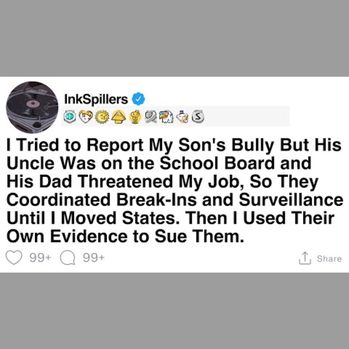I attempted to report my son's bully, but faced obstacles as the bully's uncle was on the school board and his dad threatened my job. They orchestrated break-ins and surveillance until I had to move states. I later used their own evidence against them in a lawsuit.