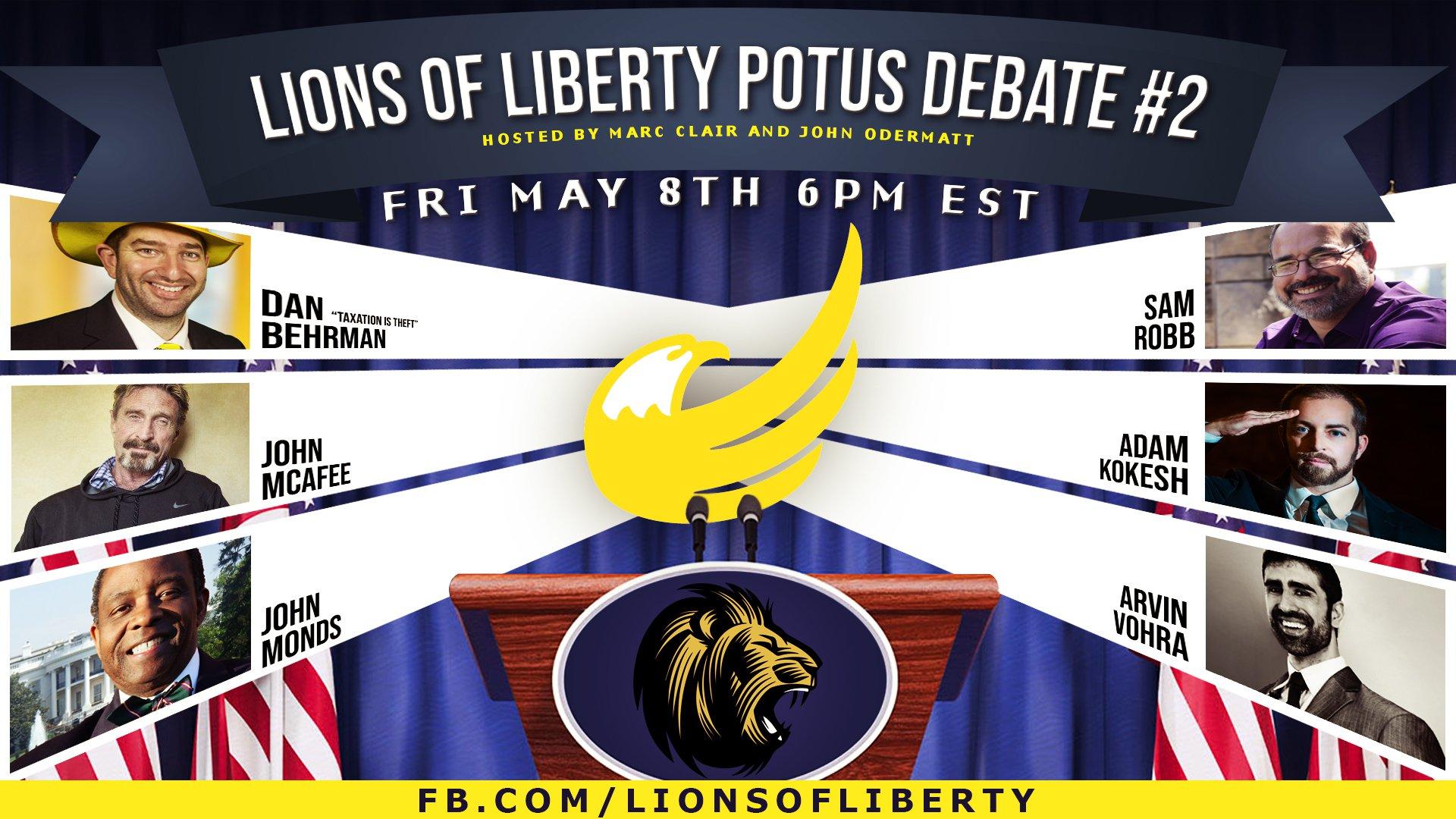 It's the 2nd Lions of Liberty Libertarian Party Presidential Debate, co-hosted by Marc Clair and John Odermatt, featuring Adam Kokesh, Sam Robb, John Mcafee, Dan "Taxation Is Theft" Behrman, Arvin Vohra and John Monds, Jr.