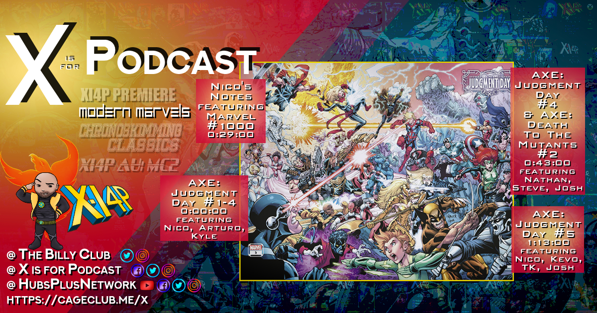 It's an all new, all judgment special on X Is For Podcast! Judgment Day is in full swing and on the X-Pack is going full force on the event! Kicking things off is a look back at Judgment Day #1-4 with a crew who (mostly) haven't weighed in on the event yet (0:00:00)! Then, in this episode's producer's segment, Nico talks about the bigger picture of Judgment Day, the future of the Marvel Universe, the potential connection to work seeded back in Marvel #1000, via Miracleman, Kirbyist judgments, meta-referential conceptualization of characters and more (0:29:00)?! Then, two more looks at Judgment Day -- Judgment Day #4 & Death To The Mutants #2 (0:43:00) is followed by Judgment Day #5! All this and more on and all new XI4P!