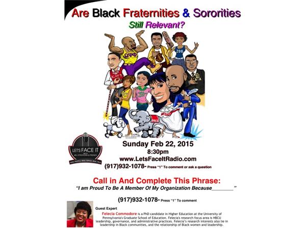 Each organization can boast of many famous and acclaimed members within its ranks. Each organization has contributed much to the communities they serve through scholarships, leadership development, social action and philanthropic endeavors. Unfortunately, each organization can also lay claim to its share of shameful activities, including thuggish campus hazing, elitist membership selection practices (i.e. selecting or refusing membership on the basis of skin color or hair texture), and misuse of organization funds for personal gain. The question posed today to guest Felicia Commodore is "Are Black Fraternities & Sororities STILL Relevant?