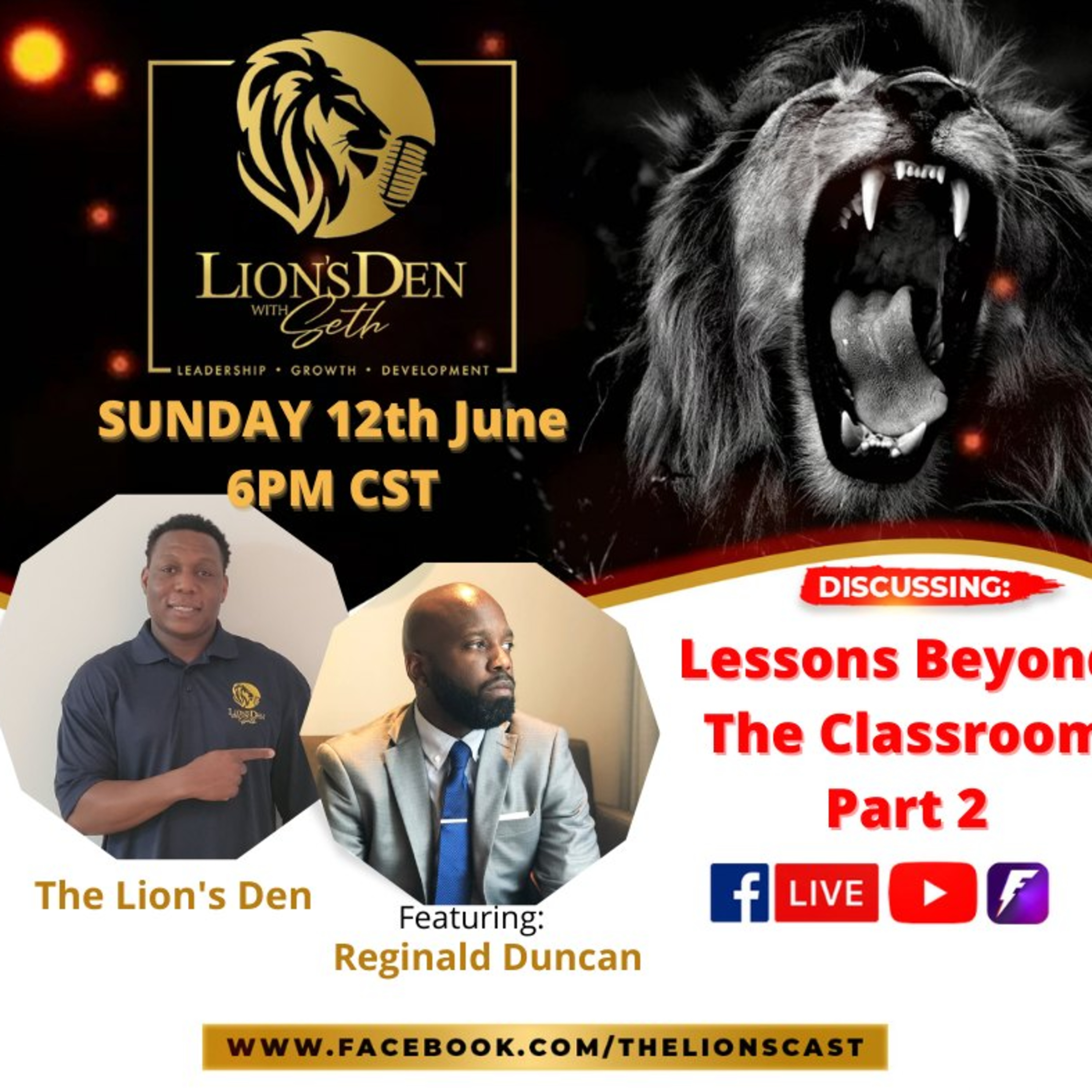 On the next episode of the Lion's Den with Seth, we'll be discussing "Lessons Beyond the Classroom" with our special guest Mr. Duncan. He will explain the importance of instilling life lessons fused with academics for this generation. Tune in this Sunday at 6 pm CST!
