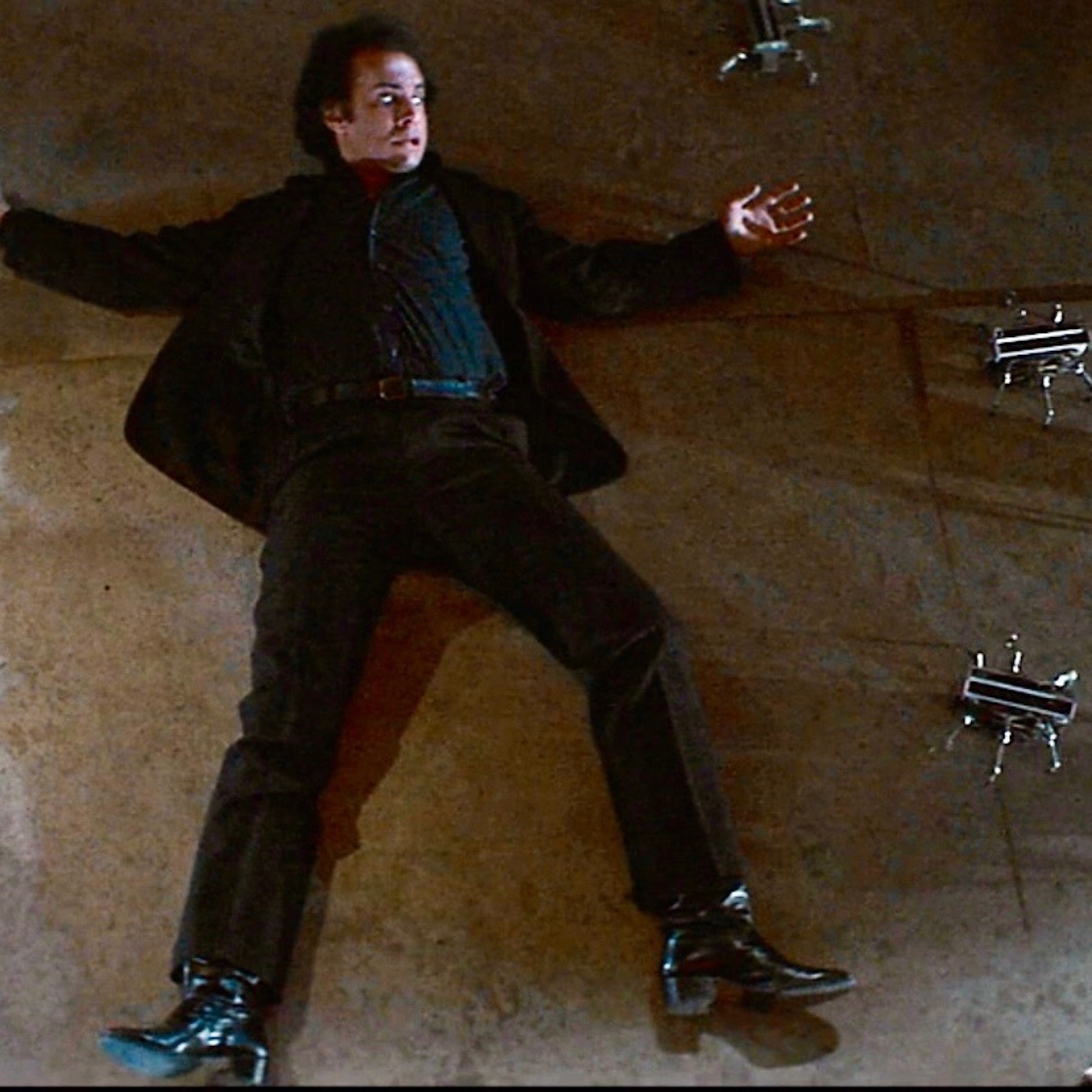 The mustachioed mythos of Jack Ramsay (Tom Selleck) is revealed and is in full force (full stalk) within this futuristic dream. Ram-Man does NOT like rogue robots. They really twiddle his stache. He also doesn’t like heights, and sometimes he becomes a real grump about it. Luckily, he’s partnered up with Karen Thompson (Cynthia Rhodes) to temper the crank. And, if Ramsay can’t grab a dinner with Jackie (Kirstie Alley), maybe it will work out with Thompson. Getting dinner seems like an integral plot point to this film. That and Dr. Luther (Gene Simmons) brandishing weapons and staring into your eyes like a madman. Well cast! Whatever! Machines are angry or something! Microchip! RTS fights off drones and tries future sushi. Jeremy dodges an array of heat-seeking smart bullets. La-Mar casually knocks around a horde of spider robots. Collin rides the corn-cutter bot to freedom. This future is bonks! And, in many ways, Michael Crichton, you predicted it well. Now, let’s talk dino DNA.