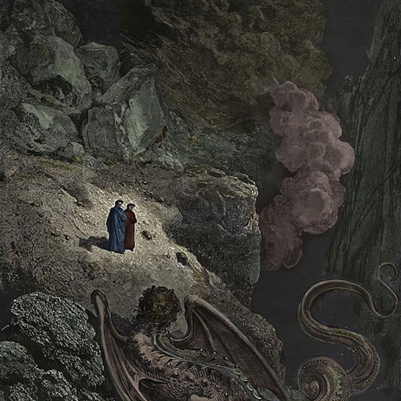 Virgil explains the overall structure of the Inferno to the Pilgrim, and the three deepest circles. Then they walk through the seventh circle, and meet the monster Geryon, flying them down into the Abyss.
