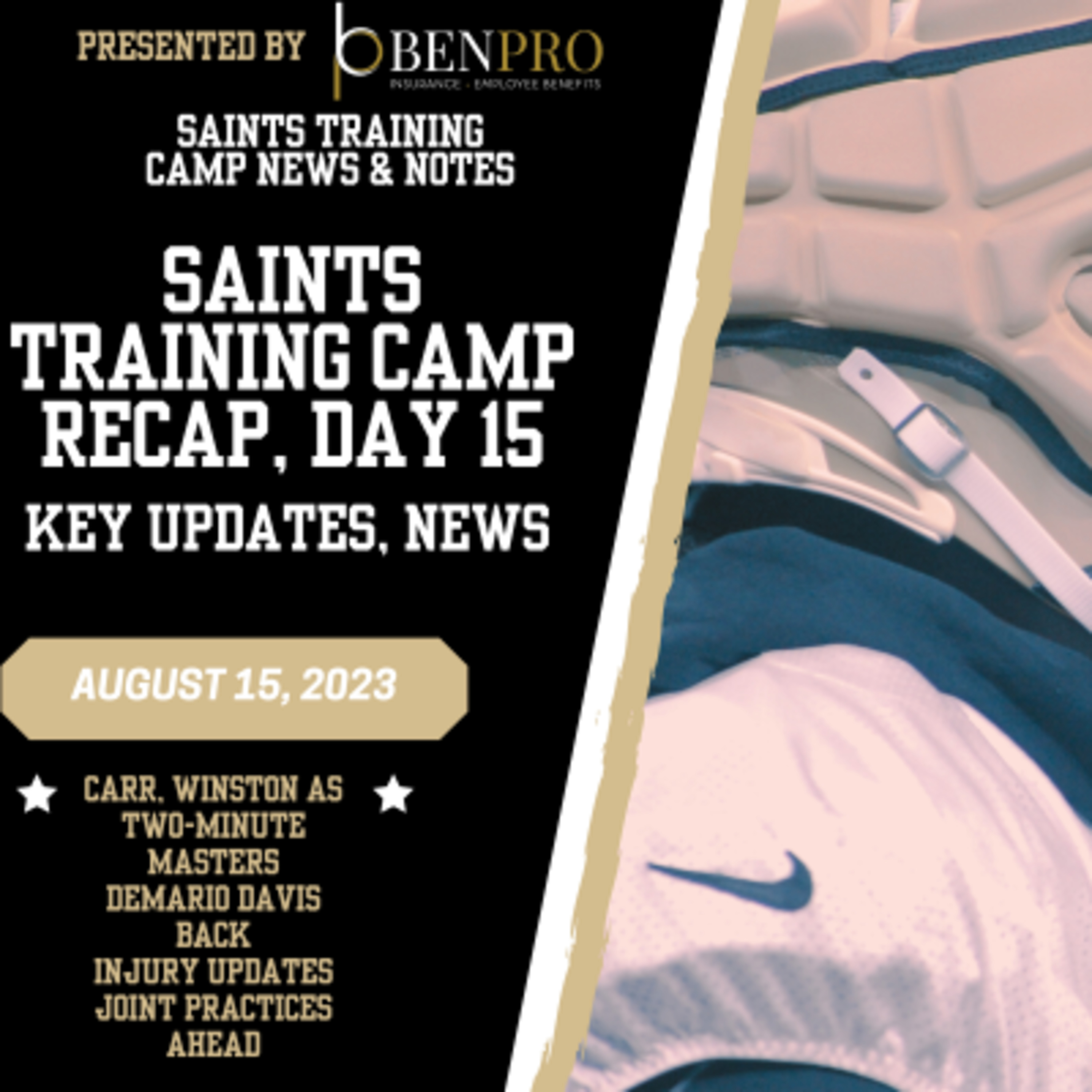 Day 15 of Saints training camp saw Derek Carr and Jameis Winston both cook in two-minute. A long-awaited return is made for a key defensive star and leader, with updates on other injuries New Orleans is dealing with. Shaq Davis had the play of the day, while Jimmy Graham and Juwan Johnson also had strong plays.