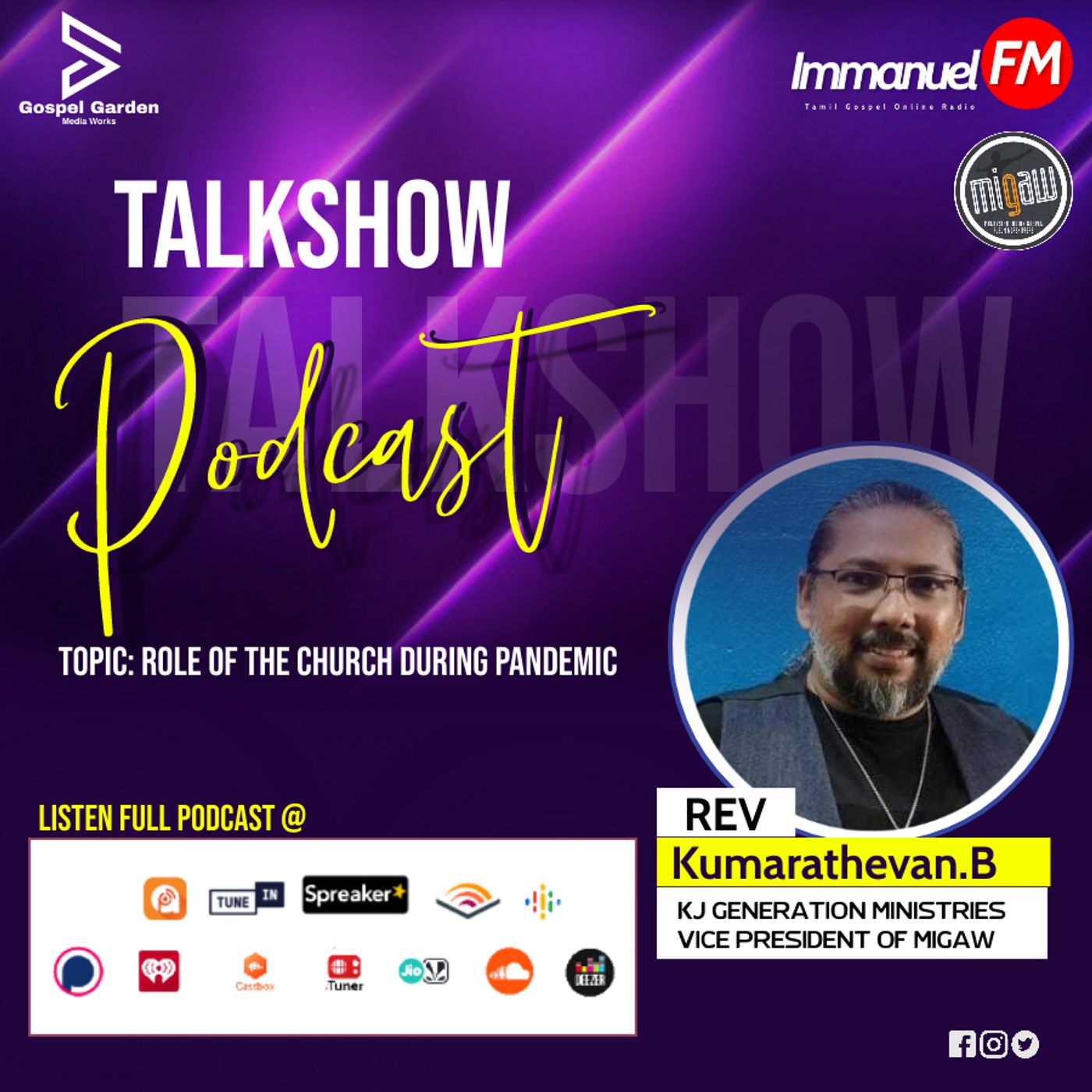 Immanuel FM was Streamed a Live talkshow on topic of THE ROLE OF THE CHURCH during pandemic with pastor Rev.Kumarathevan.B from KJ Generation Ministries and he is also a vice president of Migaw. Listen full Podcast and share. God bless you.Amen.