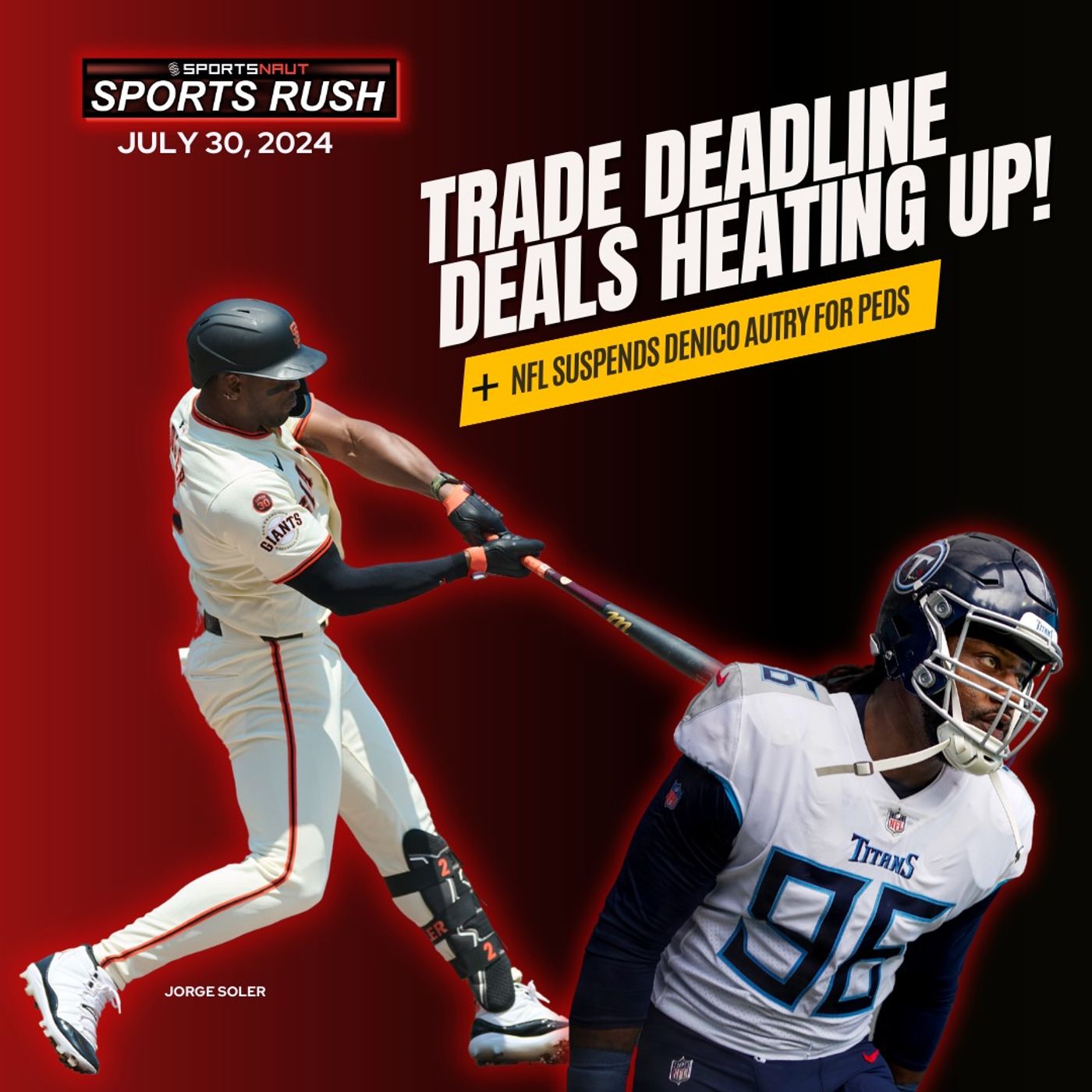 Today is the MLB Trade Deadline...and the deals are starting to come in spurts! So far, Jorge Soler has returned to the Braves; we tell you about a huge 3-team trade that shakes up the impending pennant races! Plus, NFL drama: Texans' Autry suspended six games. The Olympic triathlon was postponed due to Seine River pollution. Get all the latest sports news and hot takes in just minutes!