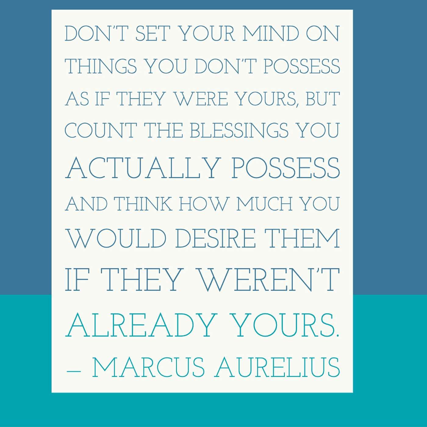 "Don’t set your mind on things you don’t possess as if they were yours, but count the blessings you actually possess and think how much you would desire them if they weren’t already yours."— Marcus AureliusWhen we think about things that we want in our lives, we also need to think about the thing that we already have, and appreciate those things. It’s easy for us to get stuck in the mindset of only focusing on the things that we don’t have in our lives. We focus on what we are lacking as a person and where we consider ourselves as failures. We can get too focused on all the material things that we don’t have and want.