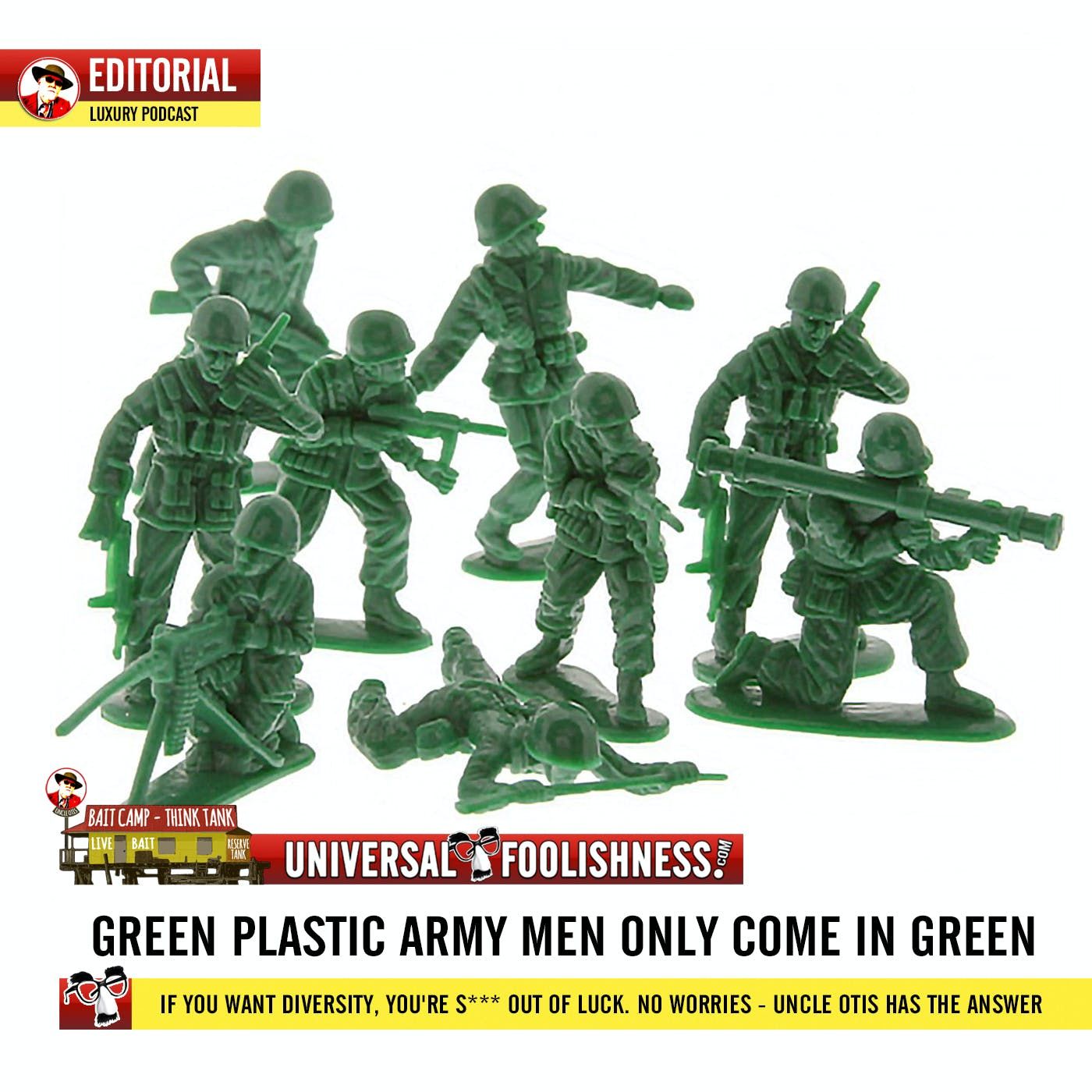 Your green plastic army men only come in GREEN. No black, brown or pink. If you want diversity, you're out of luck. So you're gonna get yelled at and probably lose your girlfriend too unless you listen to Uncle Otis here to tell you what to do about it. Be sure to tell others of your kind about what goes on here. Push button. Get Otis. Wash hands. A service of Galveston's Discount Think Tank & Bait Camp.
