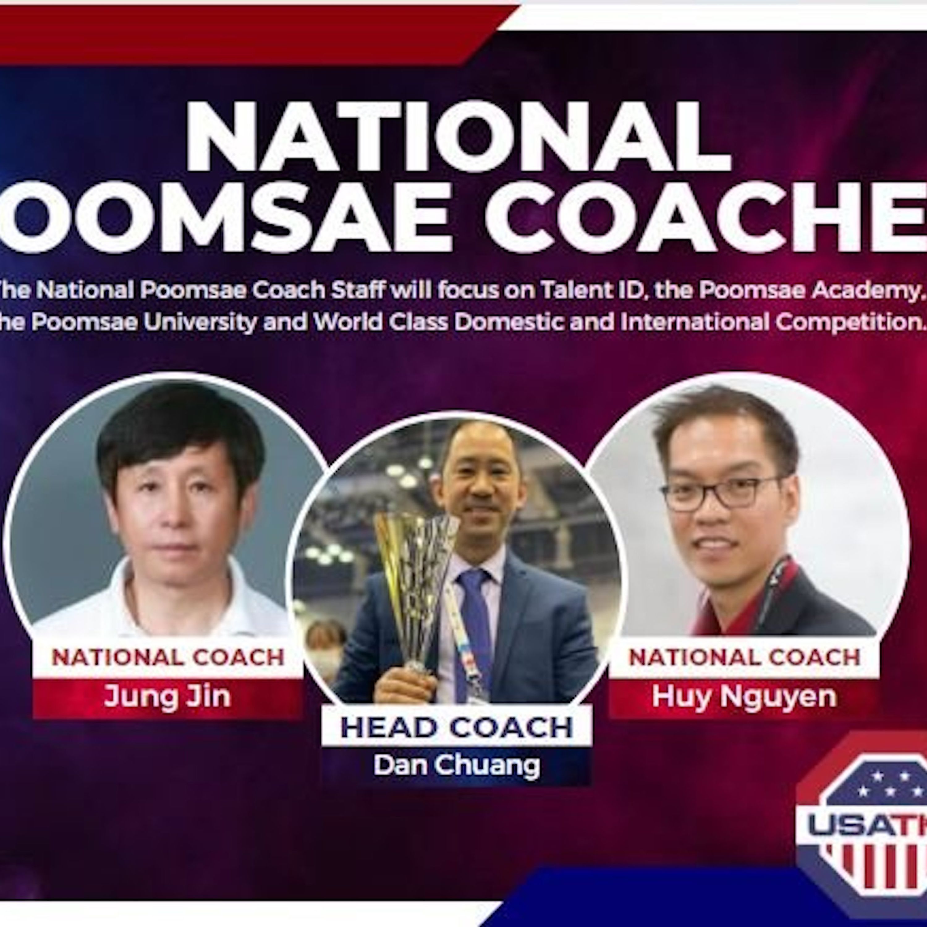 USATKD is proud to announce the 2-year appointment of our National Poomsae Coaching Staff: Head Coach Dan Chuang and National Coaches Jung Jin and Huy Nguyen.