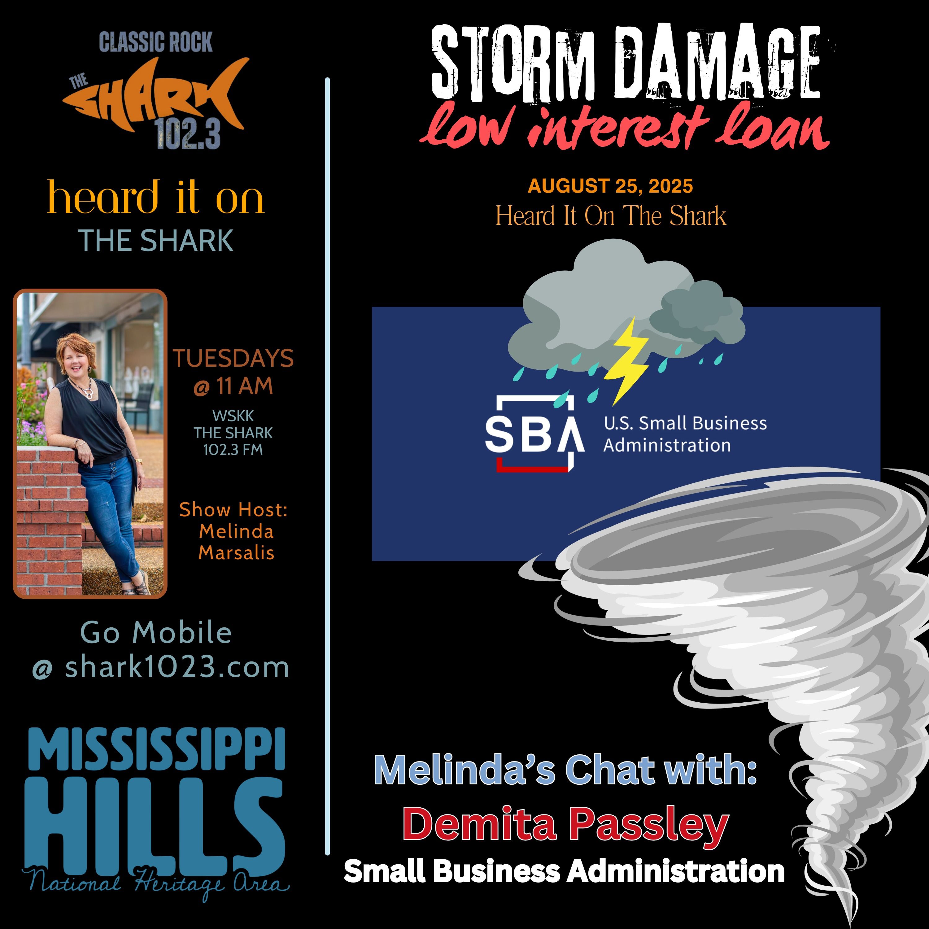 Welcome to HEARD IT ON THE SHARK with your show host Melinda Marsalis and show sponsor, Mississippi Hills National Heritage Area. HEARD IT ON THE SHARK is a weekly interview show that airs every Tuesday at 11 am on the shark 102.3 FM radio station based in Ripley, MS and then is released as a podcast on all the major podcast platforms. You’ll hear interviews with the movers and shakers in north Mississippi who are making things happen. Melinda talks with entrepreneurs, leaders of business, medicine, education, and the people behind all the amazing things happening in north Mississippi. When people ask you how did you know about that, you’ll say, “I HEARD IT ON THE SHARK!” HEARD IT ON THE SHARK is brought to you by the Mississippi Hills National Heritage area. We want you to get out and discover the historic, cultural, natural, scenic and recreational treasures of the Mississippi Hills right in your backyard. And of course we want you to take the shark 102.3 FM along for the ride.