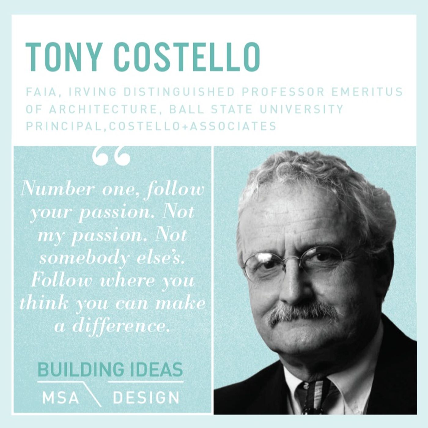 Tony Costello has been an educator / practitioner for his entire 54+ year career as an architect. He holds the title, Irving Distinguished Professor Emeritus of Architecture at Ball State University, retiring as a full-time faculty member in 2005 after 38 years. He has continued for the last 16 years in an adjunct capacity and teaches one elective course a year and is involved in the Department of Architecture Professional Advisory Board.