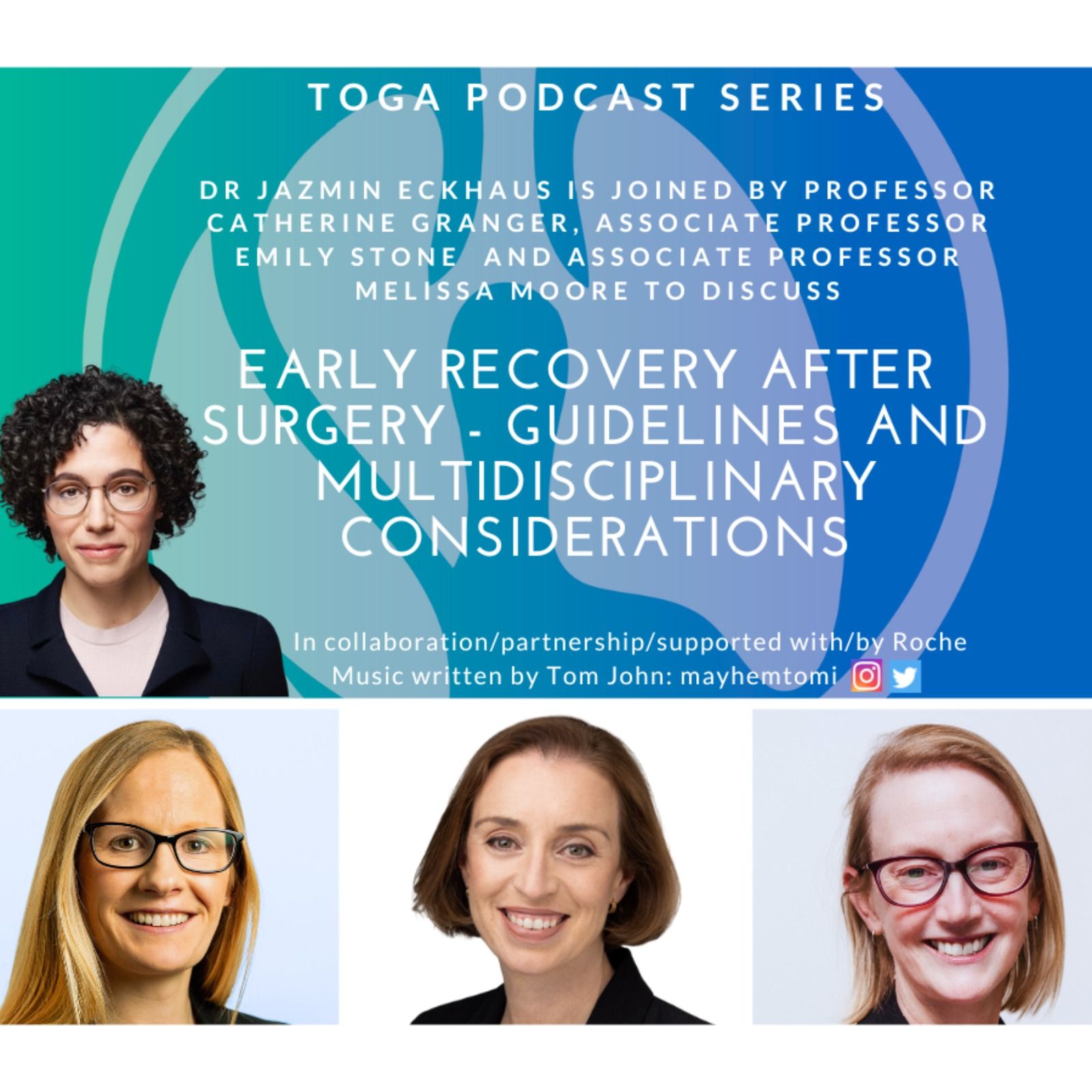 Dr Jazmin Eckhaus, a thoracic surgeon from The Austin, Melbourne, is joined by A/Prof Emily Stone, Head of Thoracic Medicine in the Dept of Thoracic Medicine and Lung Transplantation at St Vincent’s Hospital Sydney, A/Prof Melissa Moore, a medical oncologist from St Vincent’s in Melbourne and Chair of the TOGA Education Committee and Professor Catherine Granger, Head of Physiotherapy Research at The Royal Melbourne Hospital and an Associate Professor of Physiotherapy at The University of Melbourne in Australia. Professor Granger is a cardiorespiratory physiotherapist and clinician scientist with expertise in physical activity and exercise for cancer patients’ populations.