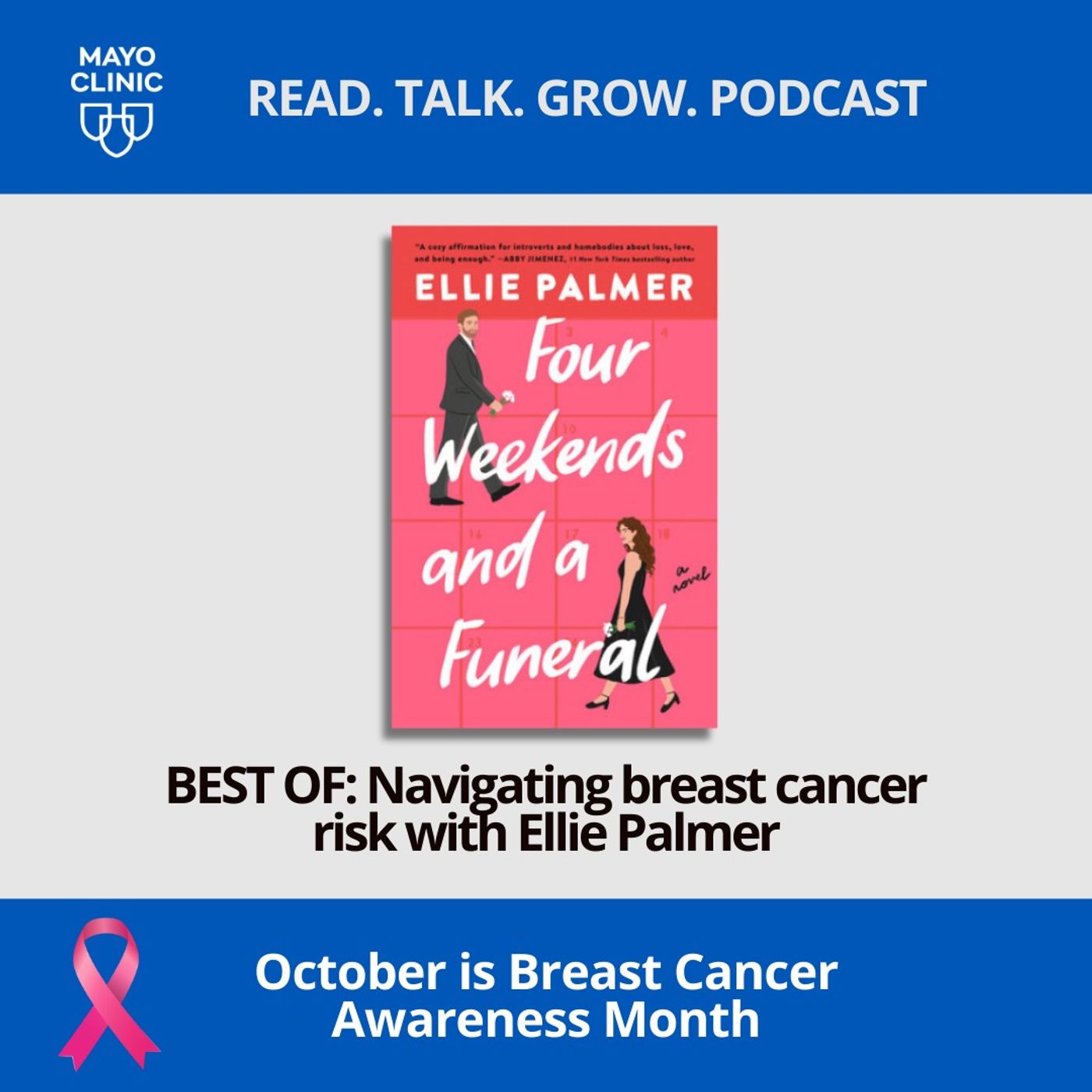 A rom-com that thoughtfully addresses death, grief and breast cancer risk? We’re in! Alison, the protagonist in the romance novel “Four Weekends and a Funeral,” is pretending that she was still dating her ex-boyfriend at the time of his death. (It’s complicated.) On top of that, she’s recently undergone a double mastectomy after finding out she a gene variant that puts her at high risk for breast cancer. Author Ellie Palmer, who has the same variant, and Mayo Clinic expert Dr. Jessica Fraker join us to talk about navigating breast cancer risk and life post-mastectomy.