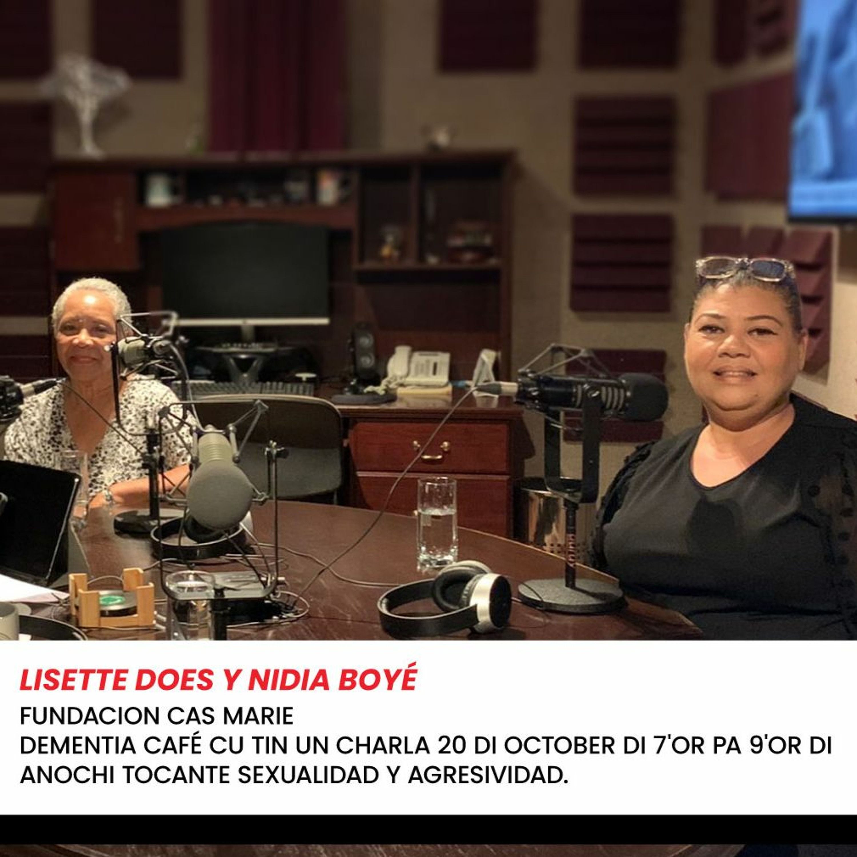 Entrevista di Dia cu Aldrich Croes pa awe 19/10/2022 tabata cu Cordinadora (Fundacion Cas Marie) Lisette Does y miembro di e team Nidia Boyé tocante Dementia Café cu tin un charla 20 di october di 7'or pa 9'or di anochi tocante sexualidad y agresividad.