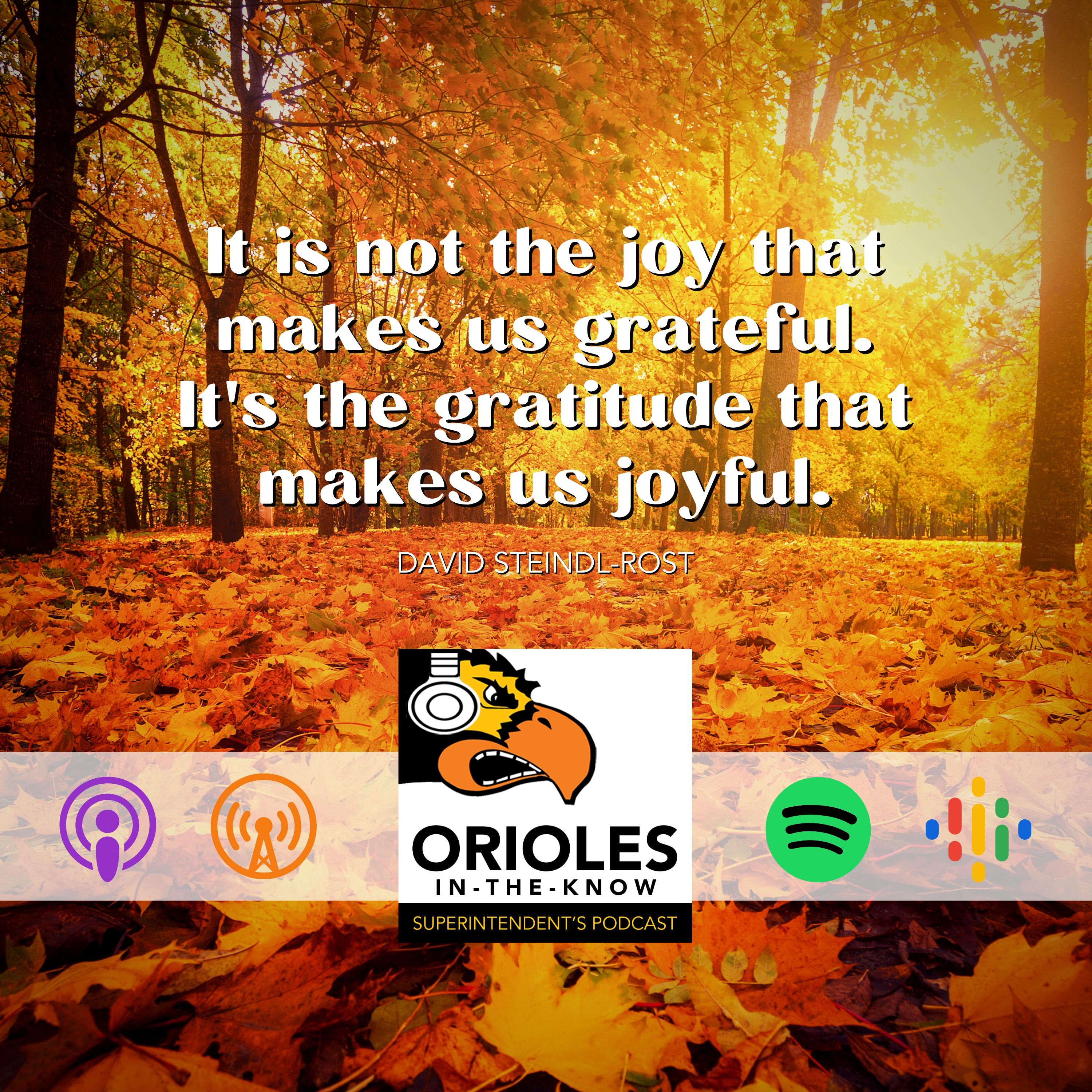 With Thanksgiving coming up, we take a break from our normal conversations and invite you into some of our classrooms. We want you to be able to hear directly from students at our elementary, intermediate, middle, and high schools as they answer a single question: What are you thankful for? So that’s what you’ll hear. From pets to sports, from friends to family, from silly to serious, you’ll hear that there are so many things that make our students thankful. You’ll even get to hear from a few of our incredible educators. We hope this episode brings a smile to your face and causes you to reflect on what you're thankful for. Happy Thanksgiving!