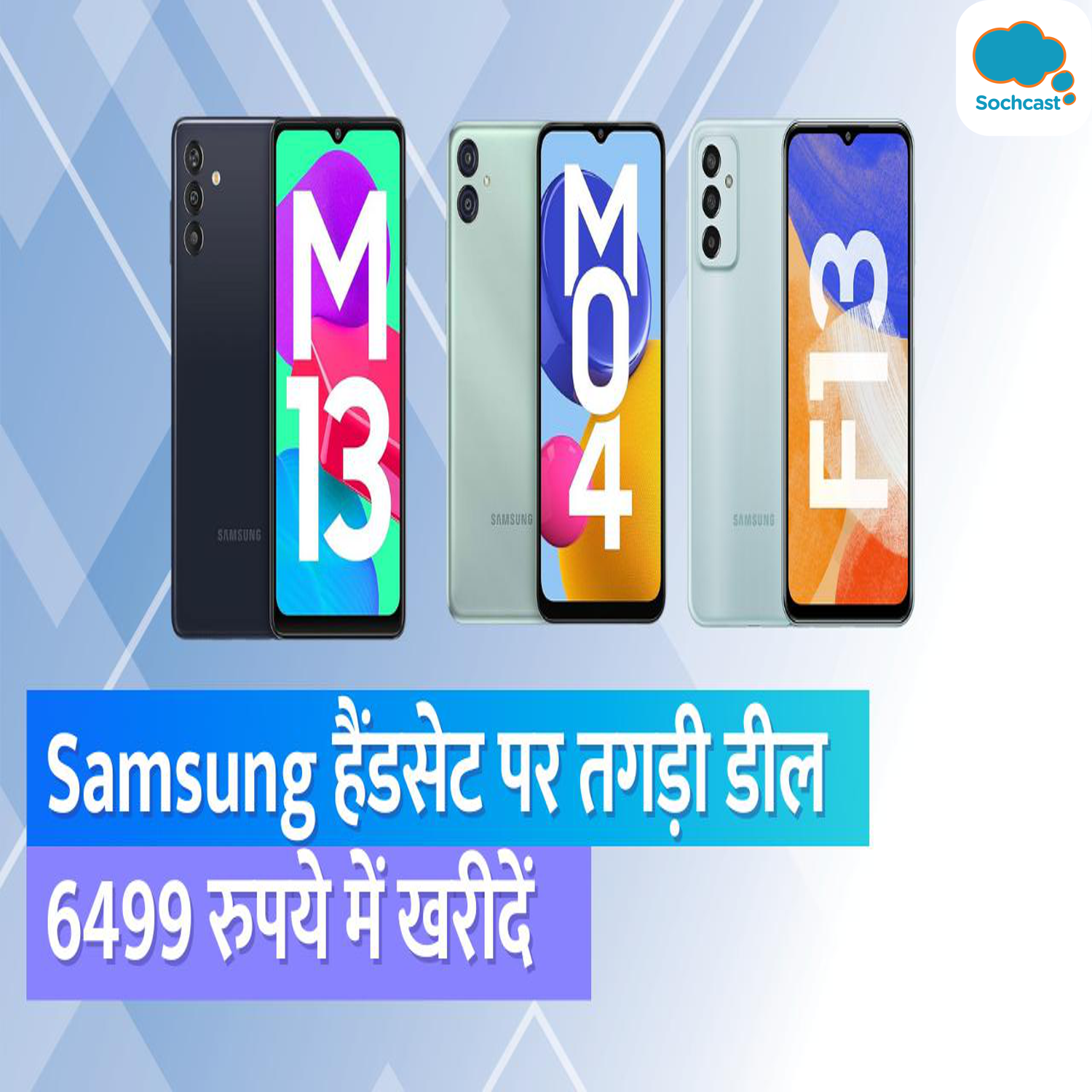 कम बजट में तगड़े फीचर्स वाला ब्रांडेड स्मार्टफोन खरीदने का मन बना रहे हैं, तो यही सही समय है. दरअसल Samsung अपने कुछ बेहतरीन हैंडसेट को 6499 रुपये की शुरूआती कीमत पर बेच रहा है. ये ऑफर फेस्टिव सीजन सेल से पहले Galaxy M और Galaxy F सीरीज के चुनिंदा स्मार्टफोन पर दिया जा रहा है.चलिए जानते हैं इन फोन्स पर मिलने वाले ऑफर्स के बारे में. Samsung Galaxy M04 तगड़ा ऑफऱ Samsung Galaxy M04 की कीमत 11999 रुपये है. कंपनी इस पर 46% का डिस्काउंट दे री है. जिसके बाद Samsung Galaxy M04 स्मार्टफोन को मात्र 6499 रुपये की कीमत पर खरीदा जा सकता है. इसके अलावा स्मार्टफोन पर 6150 रुपये का एक्सचेंज ऑफर भी दिया जा रहा है. हालांकि पुराना फोन अच्छी कंडीशन में होने पर ही इसे अवैल कर पाएंगे. स्मार्टफोन में 4GB रैम और 64GB स्टोरेज है.वहीं 50MP का रियर कैमरा और 8MP का सेल्फी कैमरा है. साथ ही 5000mAh की बैटरी भी दी गई है. Samsung Galaxy M13 Samsung Galaxy M13 को 9199 रुपये की शुरुआती कीमत में खरीदा जा सकेगा. फोन की मूल कीमत ₹14,999 रुपये है. इसमें 50MP ट्रिपल कैमरा, फुल HD+ डिस्प्ले और 6000mAh की बड़ी बैटरी दी गई है. इसके अलावा एक्सचेंज ऑफर में 8,700 रुपये तक की छूटदी जा रही है. Samsung Galaxy F13 Galaxy F13 को 9,199 रुपये की कीमत पर लिस्ट किया गया है. जो एक शानदार डिस्काउंट ऑफर है. फोन की मूल कूीमत 14, 999 रुपये है. वहीं ये ₹ 6700 के एक्सचेंज ऑफर में भी दिया जा रहा है. फोन में 6.6 फुल एचडी+ डिस्प्ले दिया गया है. साथ ही 6000mAh की बैटरी के साथ 50MP ट्रिपल कैमरा दिया गया है. Galaxy F13 में 4GB RAM और 64GB स्टोरेज है यह भी देखें: ₹5000 की फ्लाइट टिकट फ्री, इस App से करें रिचार्ज; Vi का धांसू ऑफर