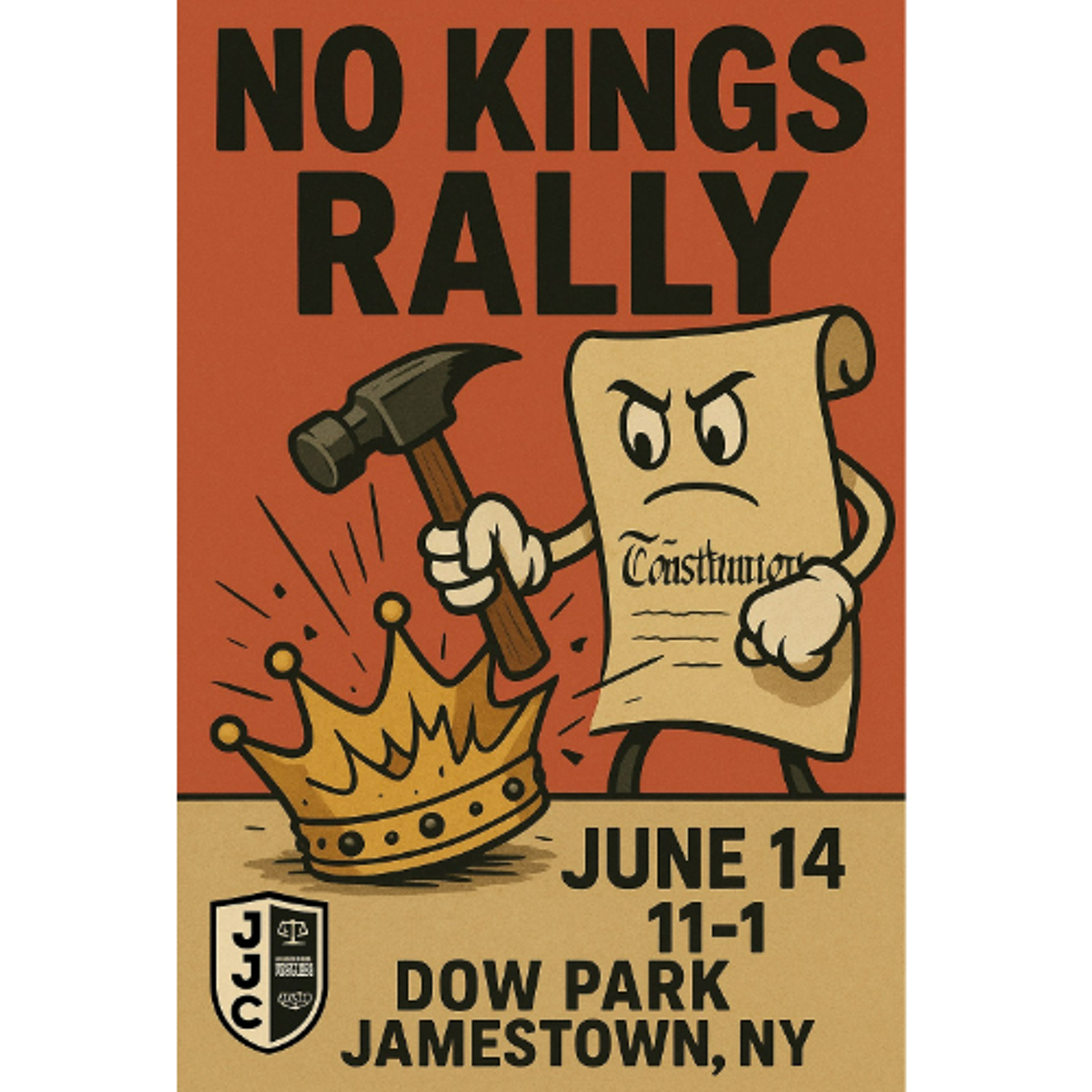 The Jamestown Justice Coalition is hosting a "No Kings Rally" from 11:00 a.m. to 1:00 p.m., Saturday, June 14 at Dow Park in Jamestown.