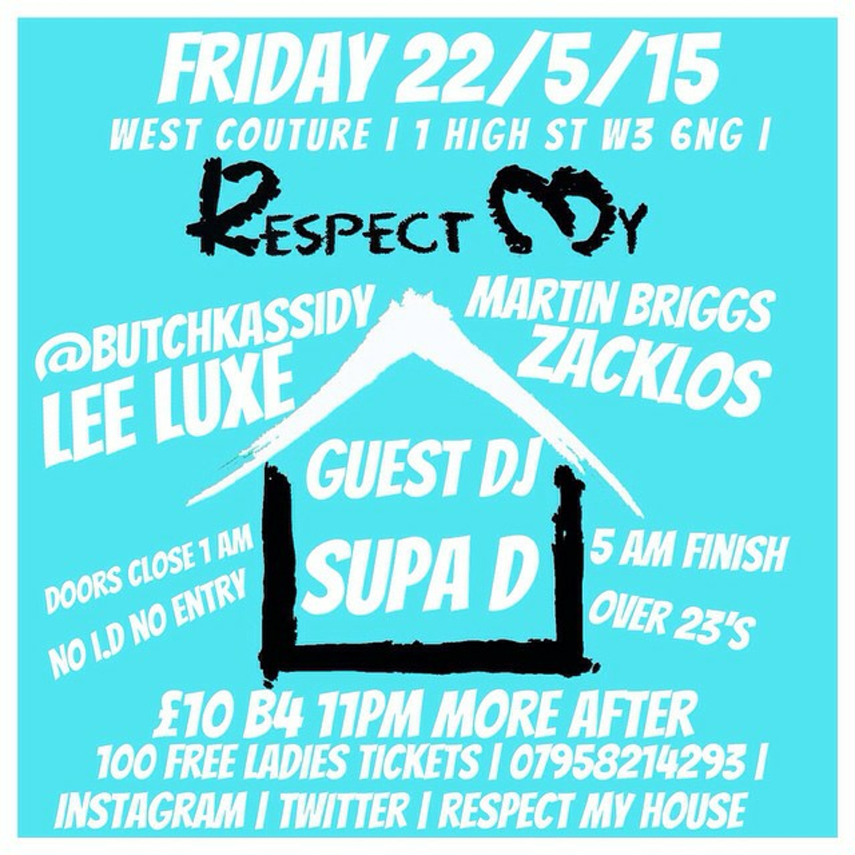 22nd May we are back!!! Respect My House @ West Couture Club & Lounge with Big Boy DJ Supa D alongside our very Talented Resident DJ Zacklos DJ Martin Briggs and Butch Kassidy plus many more!