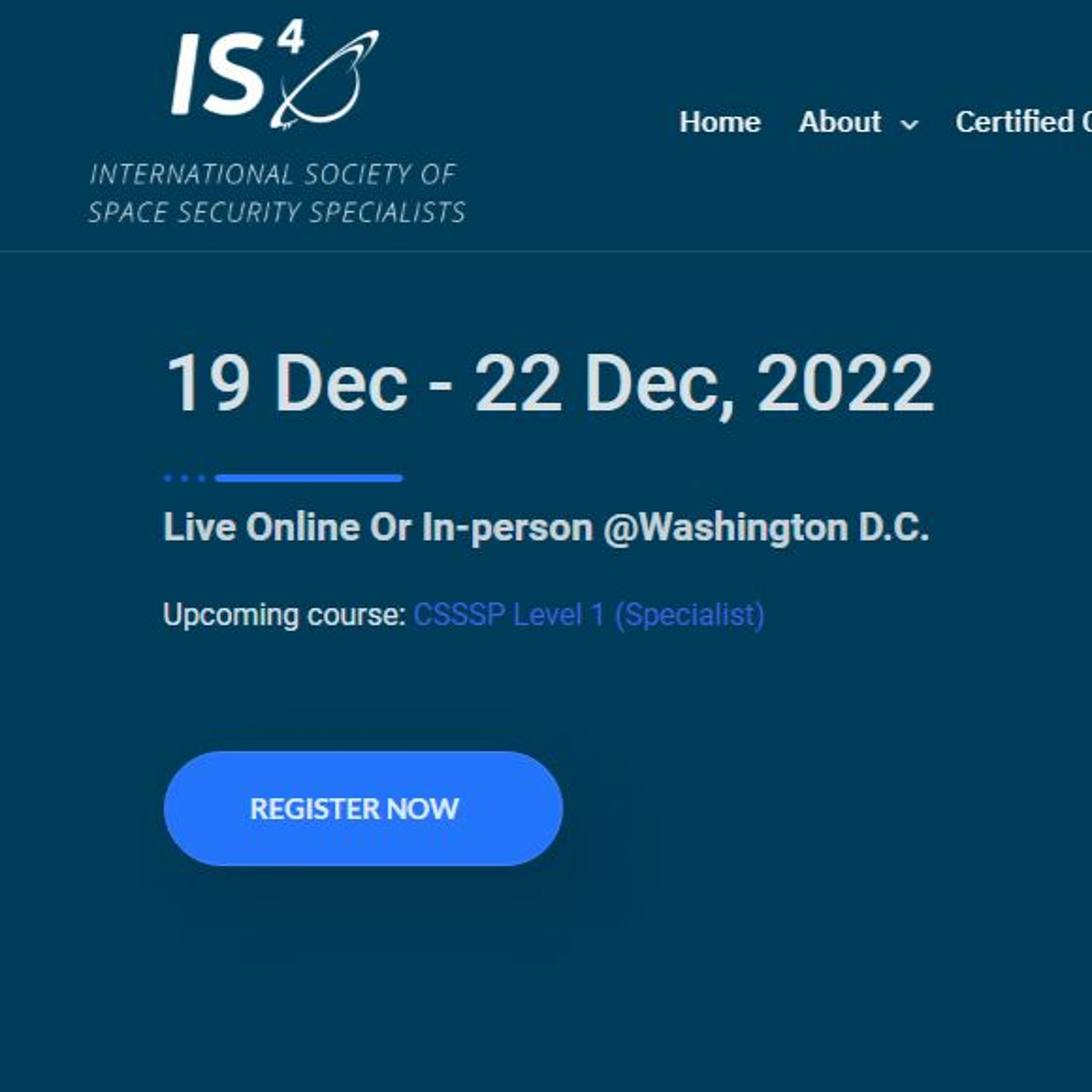Upcoming at 19 Dec - 22 Dec, 2022. Get IS4 CSSSPĀ® Certified. Register Today CSSSP Space Cybersecurity Certification Course. Space cybersecurity is a rapidly growing field that has been in need of a solid foundation for years. https://is4.org/get-certified/