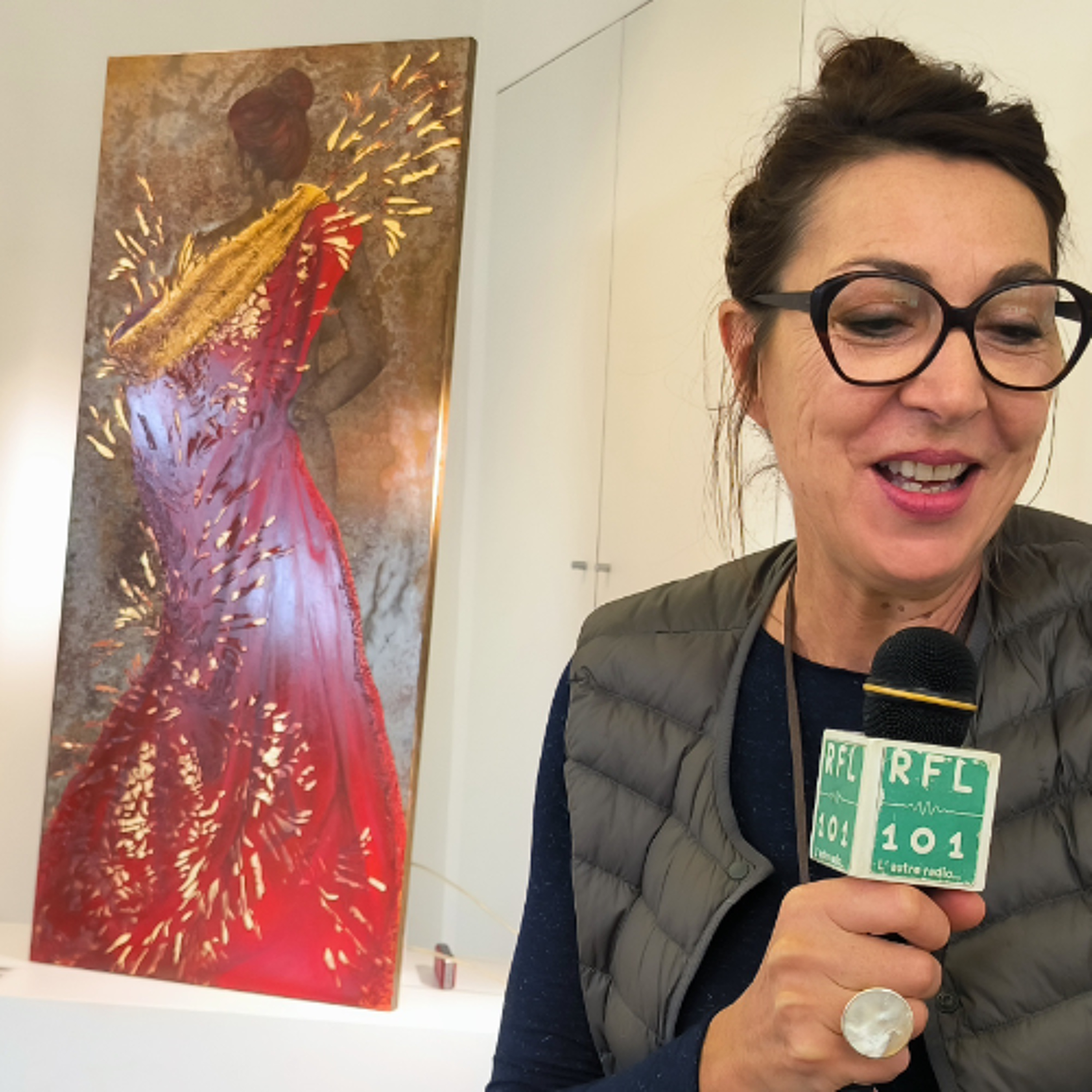 [Emission Chromatique] Délicatement acier -Du 20 septembre au 11 octobre 2025 / La Grange - Exposition de peintures de Nathalie Chossec. L'artiste a construit un univers apaisant au fil de ses voyages et de ses rencontres. De l’Orient, elle évoque le glissement des carpes koï, les textures soyeuses des drapés qu’elle dépose sur de l’acier oxydé suggérant ainsi des fonds mystérieux. Elle emprunte à des savoir-faire traditionnels un graphisme raffiné et précis. L’huile pour le trait, la laque pour la transparence, les feuilles d’or, de cuivre ou d’argent pour l’éclat, les pigments et le stuc pour la vibration des motifs. Entre nature et sensualité, son univers se décline sur de grands panneaux de métal, parfois sertis de rouille, parfois modelés révélant la profondeur de l’œuvre