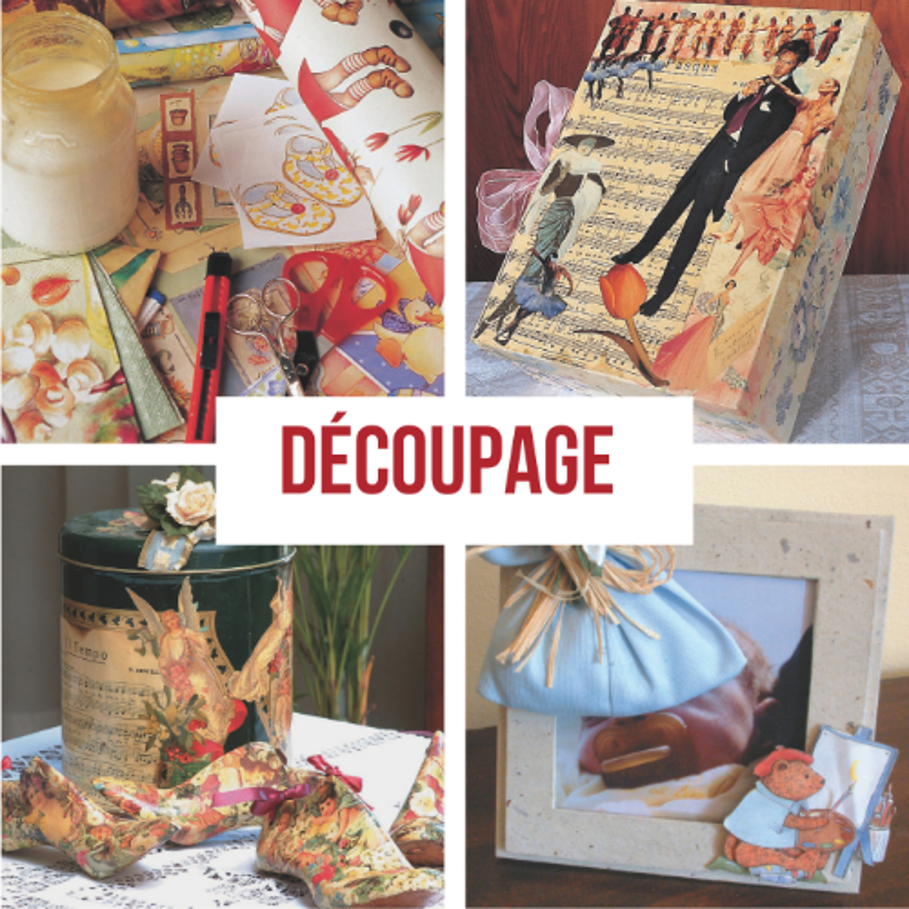 El découpage es un arte, cuyos orígenes deben buscarse en la antigua China, que embellece, revistiéndolos con recortes de papel, muebles, accesorios y objetos decorativos. Con este interesante libro puede aprender diversas técnicas decorativas como la tradicional, el découpage con servilletas y el tridimensional, que le permitirá realizar decoraciones tridimensionales y en relieve. También dispondrá de todas las indicaciones para preparar las superficies, pegar los recortes de papel y realizar los acabados con los barnices adecuados. Con pocos materiales y toda la fantasía que quiera poner podrá renovar y enriquecer accesorios, así como objetos y complementos de una forma absolutamente original: muebles, cunas, revisteros, portalápices, cuadros y marcos, relojes, soportes para velas y centros de mesa, álbumes y libros, paneles, platos y bandejas, y vasos y botellas. De esta manera podrá adornar y dar un nuevo aspecto a cualquier rincón de su casa, así como confeccionar bonitos objetos para regalar a sus amigos.