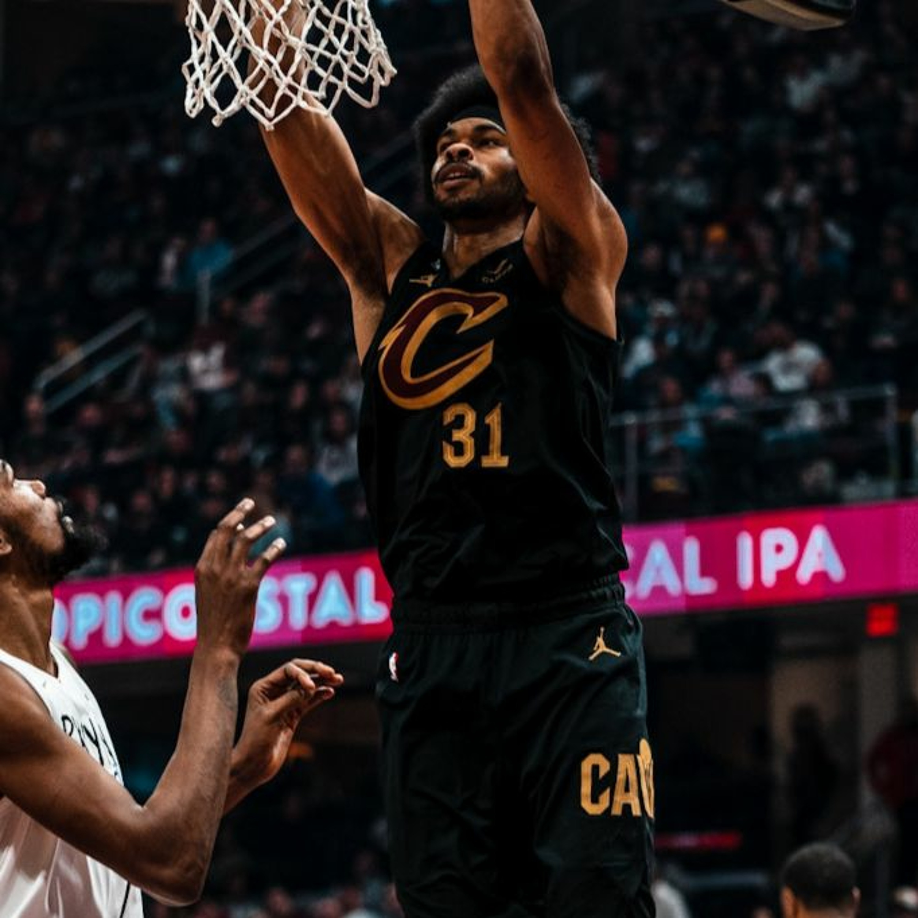 Jarrett Allen gets up for a put back slam against the Nets.