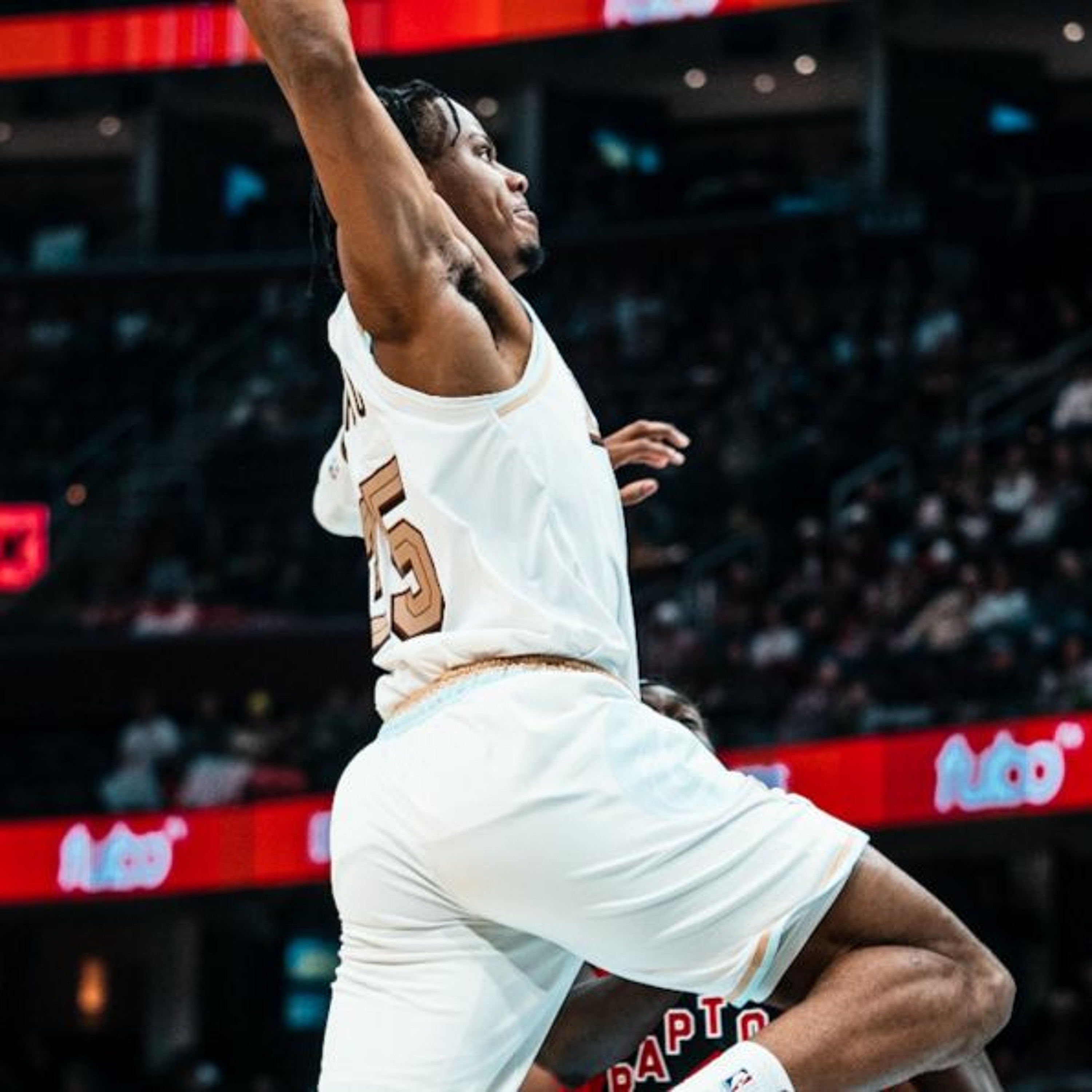 Isaac Okoro throws down a one-handed jam on the break early in the game against Toronto.