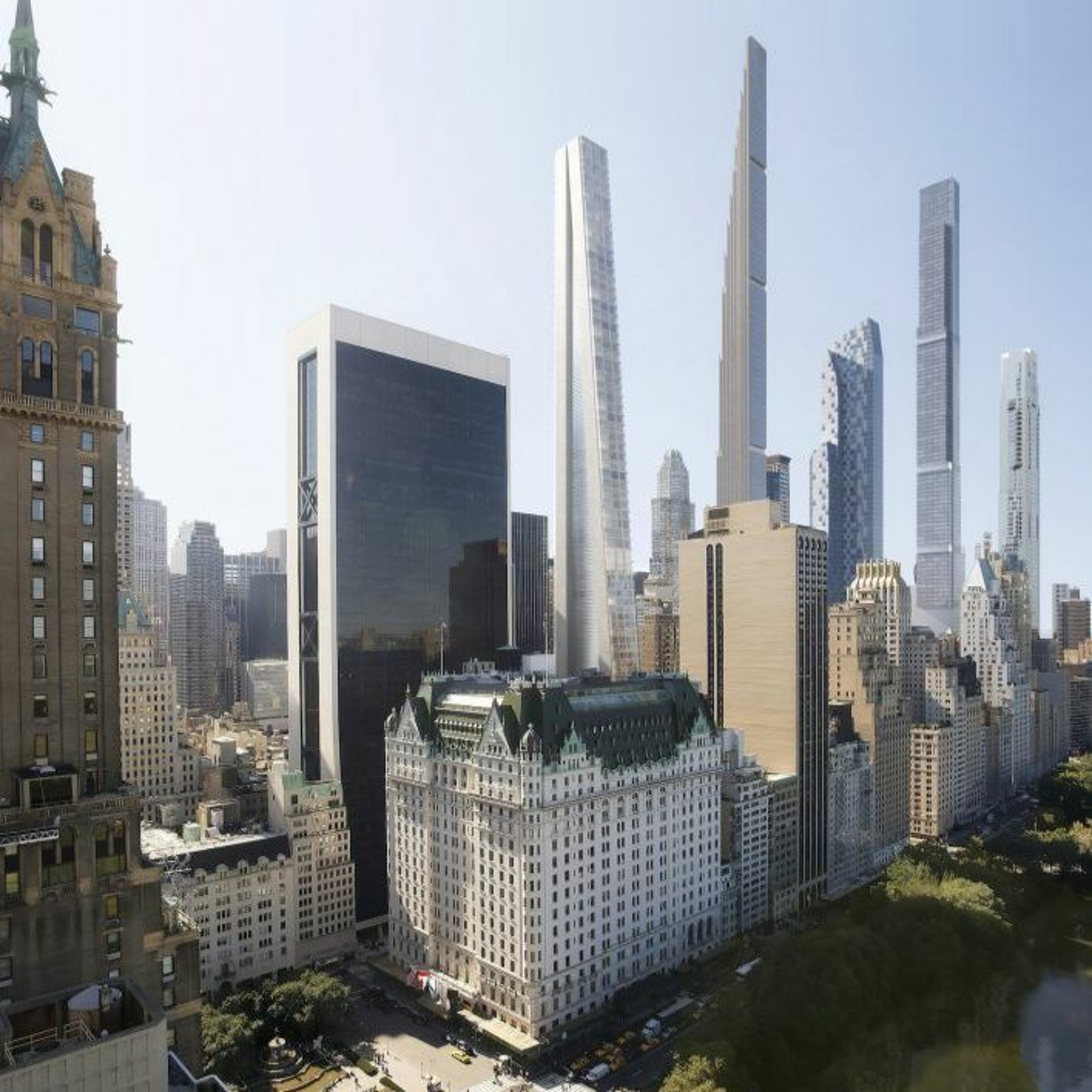 Demolition of structures at 41-47 West 57th Street in Midtown Manhattan to make way for a 1,100-ft-tall, mixed-use supertall designed by OMA and developed by Sedesco is complete, New York YIMBY reports. In exchange for rezoning to allow greater density and height, the developer agreed to provide two new Americans With Disabilities Act-compliant elevators at the 57th Street subway station located 250 ft to the east. As long as the rezoning is greenlit, the structure will total 443,098 ft2, housing 119 residential units, a 158-room hotel and a 10,212-ft2 restaurant. At this height, it would rise 96 ft higher than Christian de Portzamparc's One57. If the rezoning is not approved and square footage is downsized to 385,706, the tower "would nonetheless still deliver a bold visual impact on the Billionaires' Row skyline."
