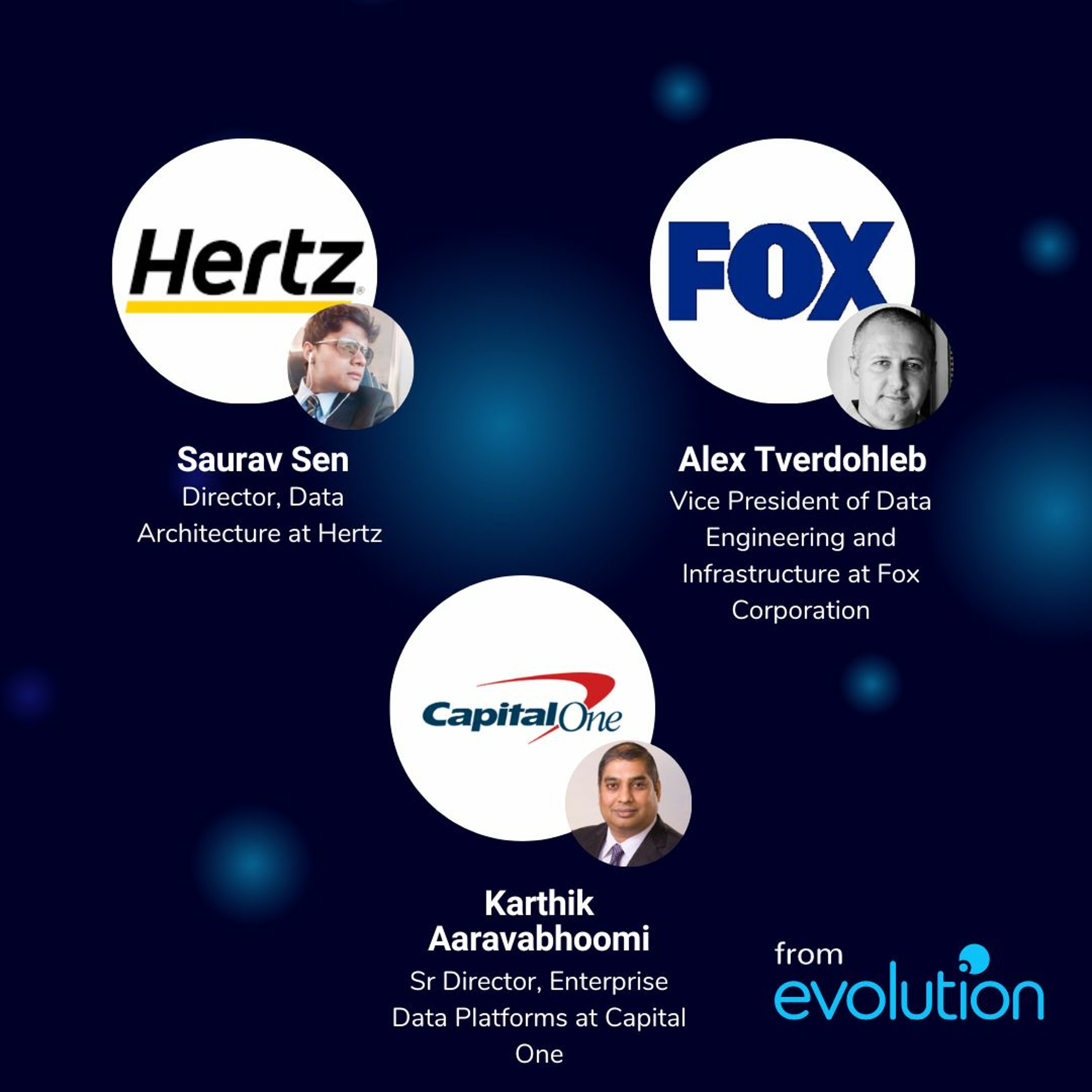 Join host Chris Hopkins as he speaks with three data experts in this episode of Evo USA. Saurav Sen, Director of Data Architecture at Hertz, Alex Tverdohleb, Vice President of Data Engineering and Infrastructure at Fox Corporation, and Karthik Aaravabhoomi, Senior Director of Enterprise Data Platforms at Capital One, come together to discuss how they are driving their data-driven companies in 2023. The guests share insights into their respective company's data strategies, how they are utilizing new technologies, and the challenges they are facing in the ever-changing data landscape. Tune in to gain valuable insights into the world of data-driven businesses.