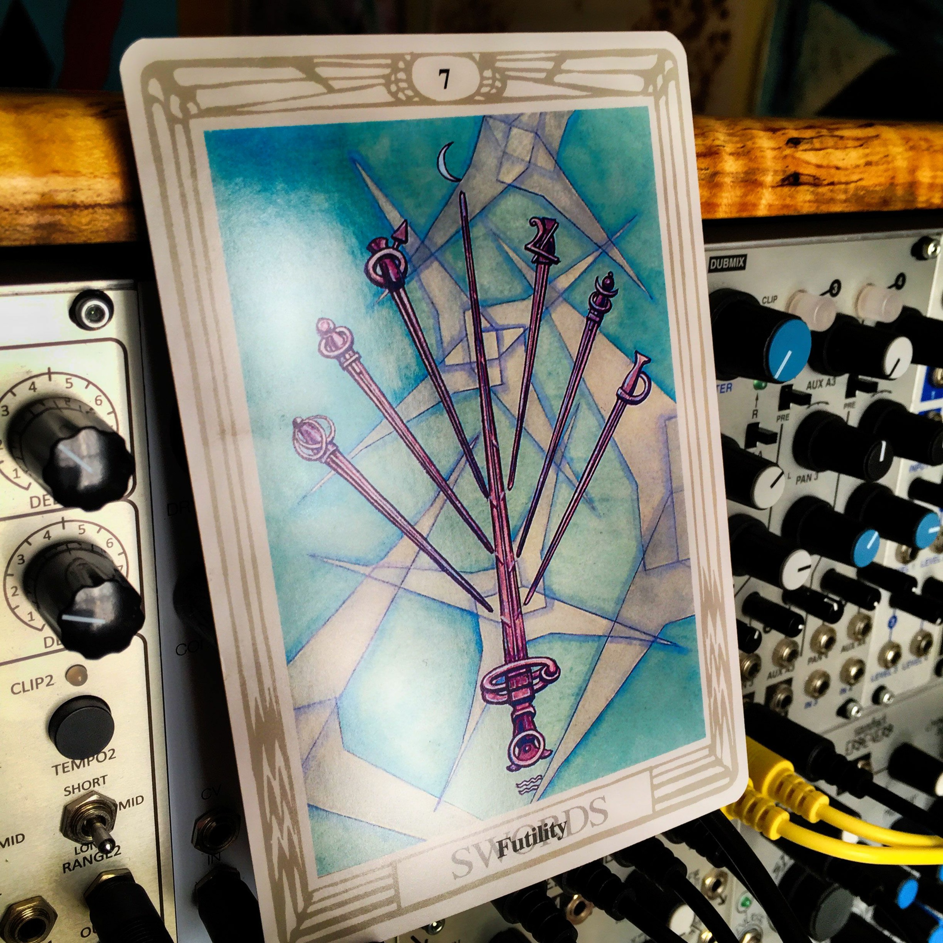 I drew from the Crowley Thoth deck to get my random number ... figured I'd draw until I hit a number between one and seven. Pulled seven on the first draw. Swords; pertaining to the mind and realms of thought. Futility; exactly what I was bumping up against in trying to come up with something for the Junto this week. Oh well, let's download the story snippet and run it through the modular to see if anything happens.