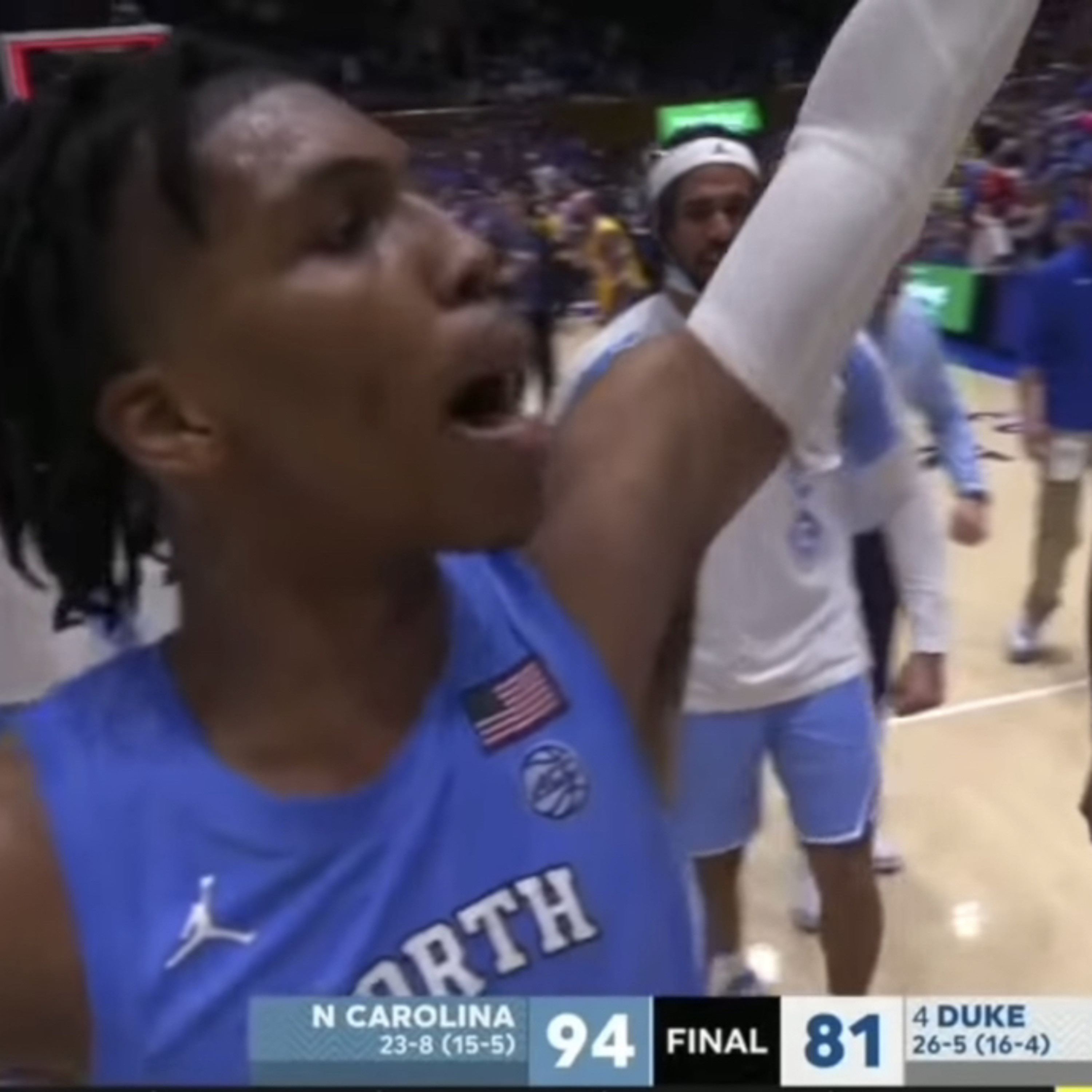 Bigg celebrates the UNC Tar Heels spoiling Coach K's final game at Duke